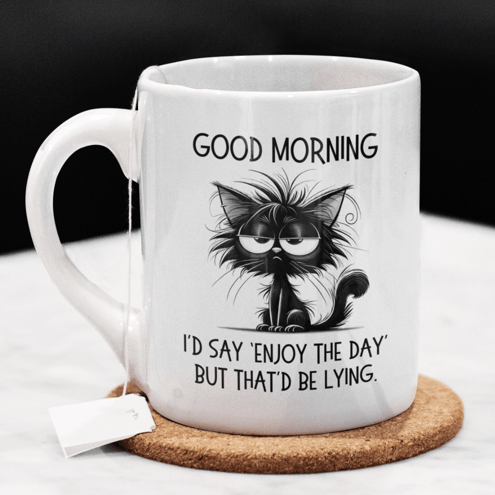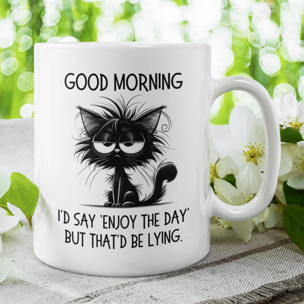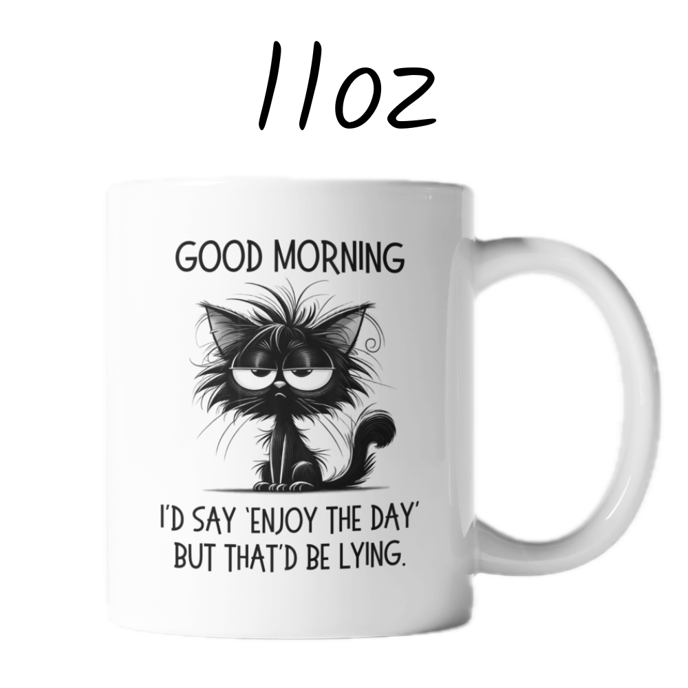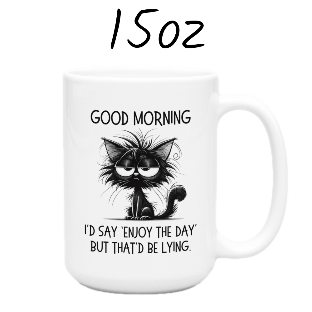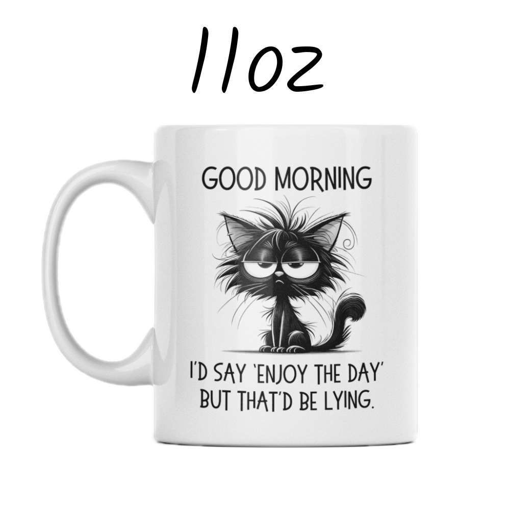 Start your day with a dose of cheeky humor with our "Good morning. I'd say 'Enjoy the day' but that'd be lying." coffee mug! Featuring a sarcastic quote and a cartoon drawing of a slightly annoyed black cat, this mug is perfect for anyone who likes their morning brew served with a side of realism.