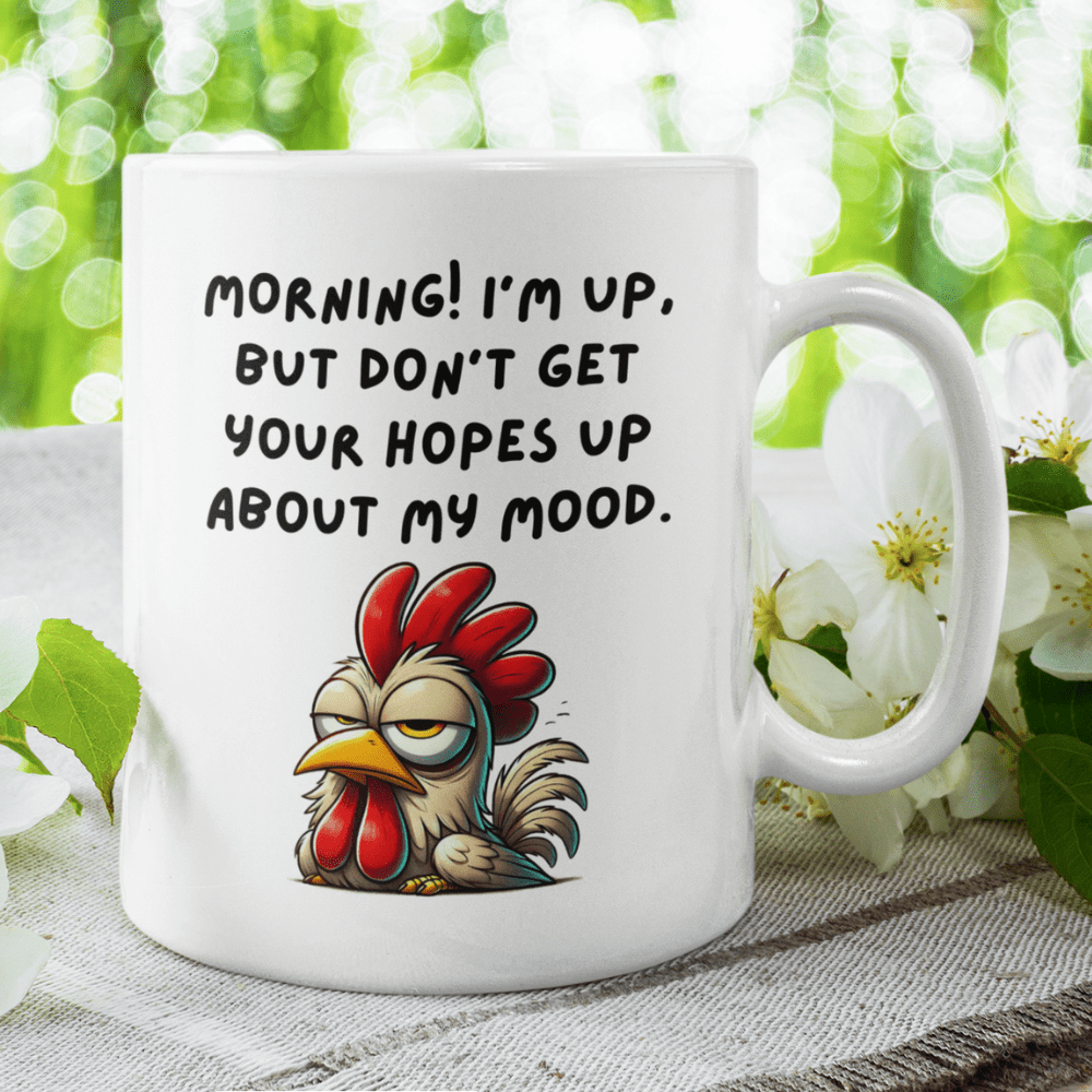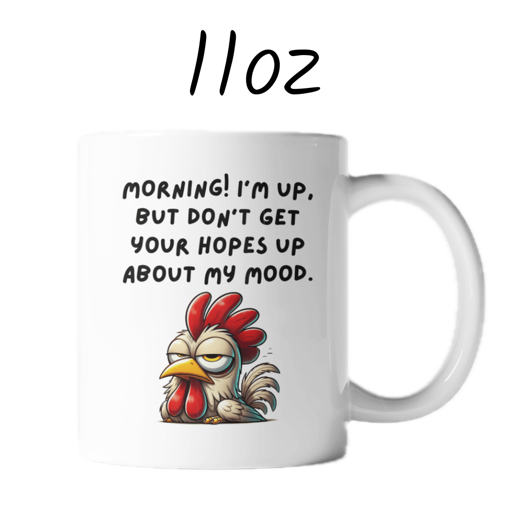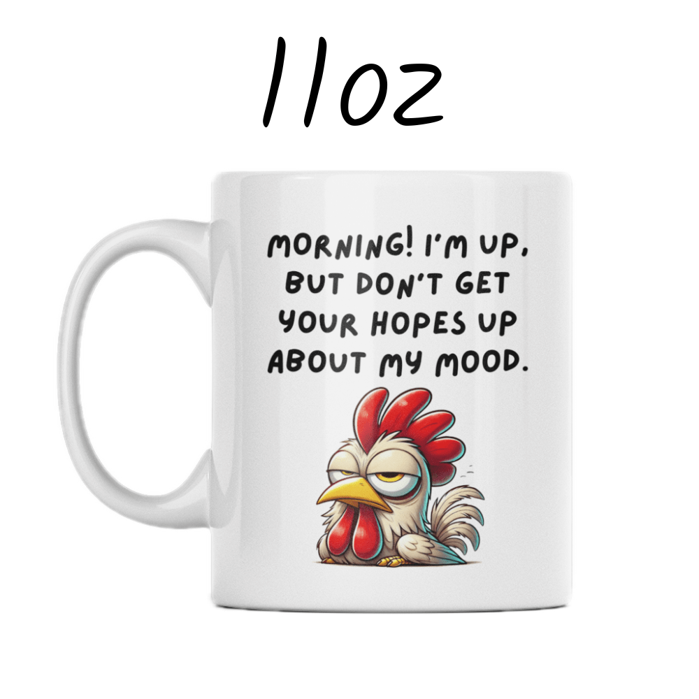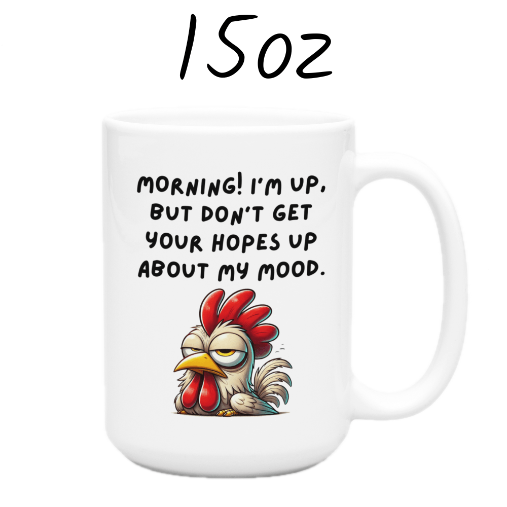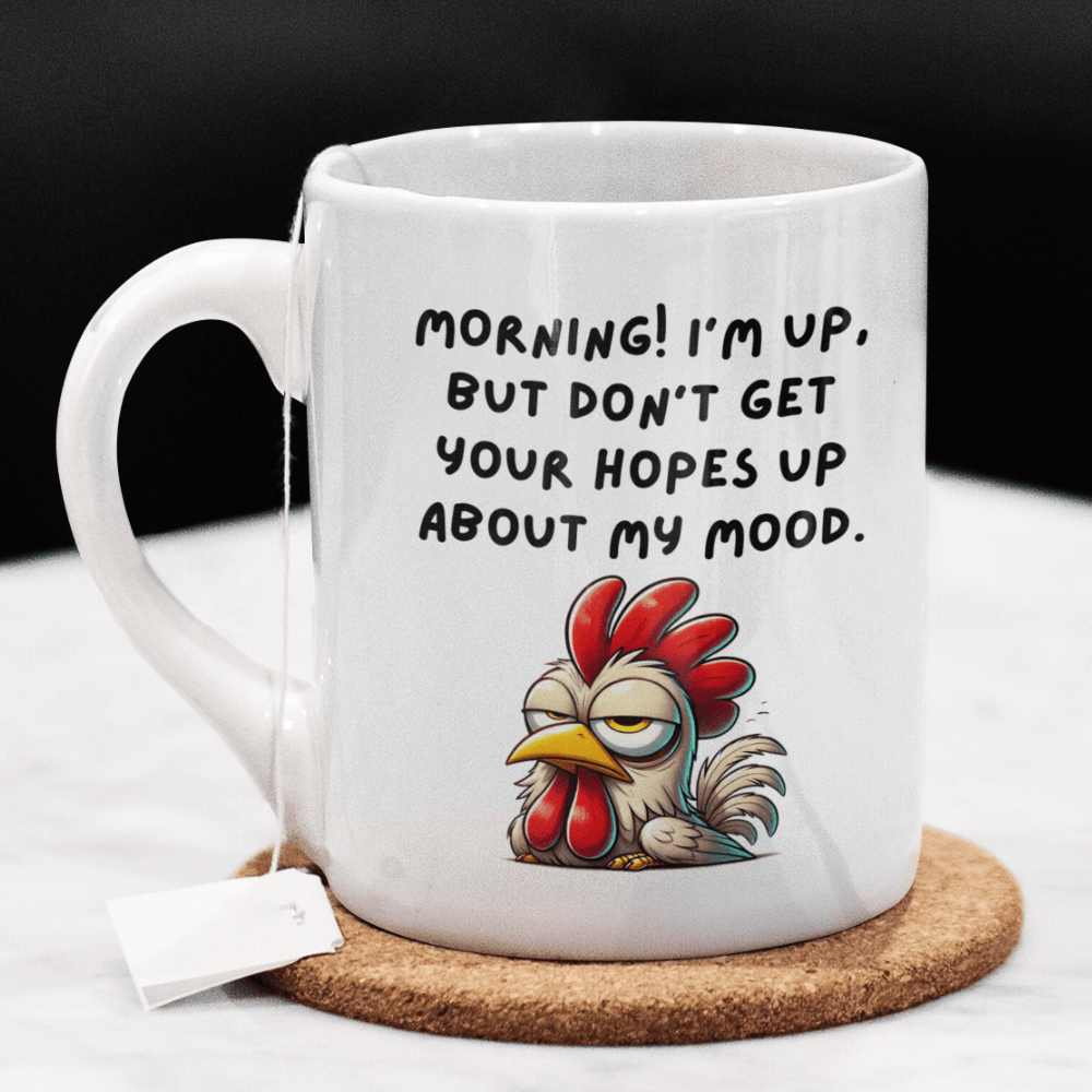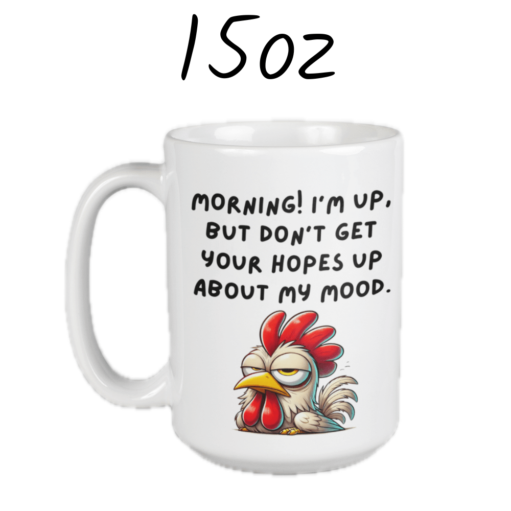 Wake up with a touch of humor with our "Morning! I'm up, but don't get your hopes up about my mood." coffee mug! This mug comes adorned with a sarcastically funny quote and a cartoon drawing of a cute, annoyed rooster, making it perfect for those who start their day a bit on the grumpy side.