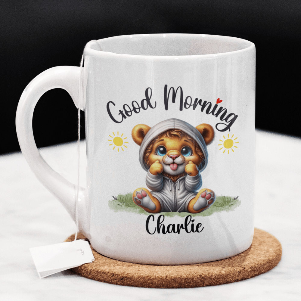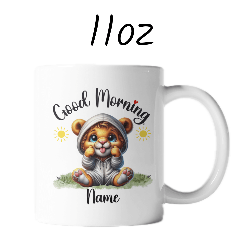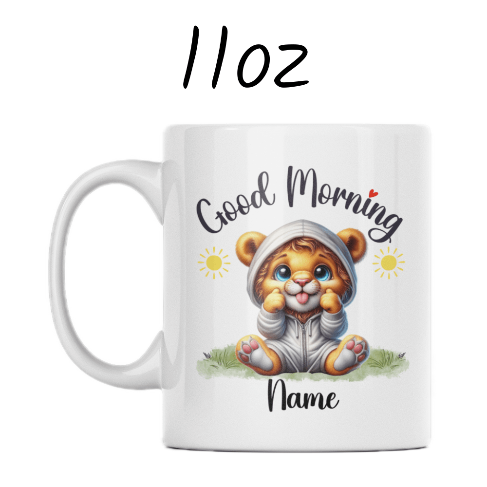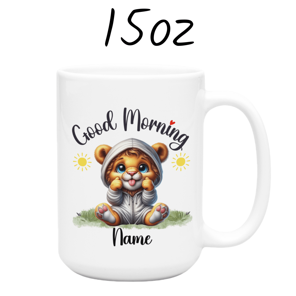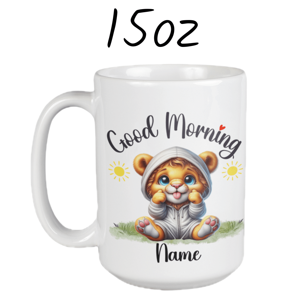 Roar into your day with our "Good Morning" lion coffee mug! This majestic mug features a beautifully cartooned depiction of a friendly lion, perfect for anyone who admires the king of the jungle. Personalize it with a name right under the lion image to make your morning cup of coffee or tea even more special.