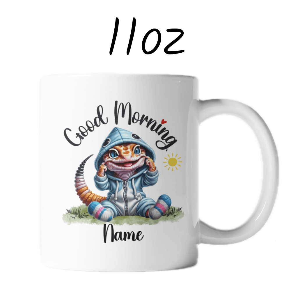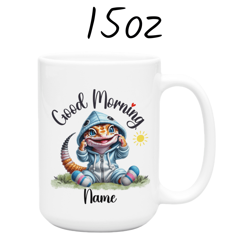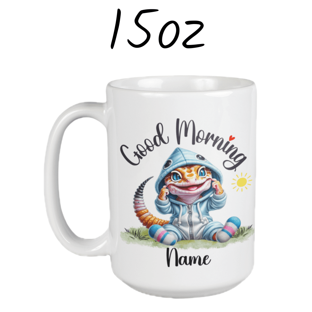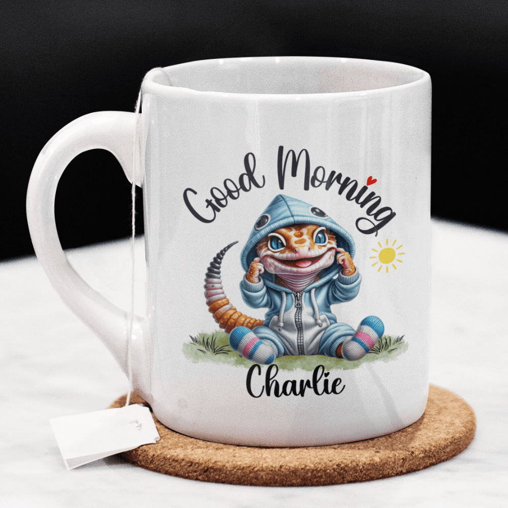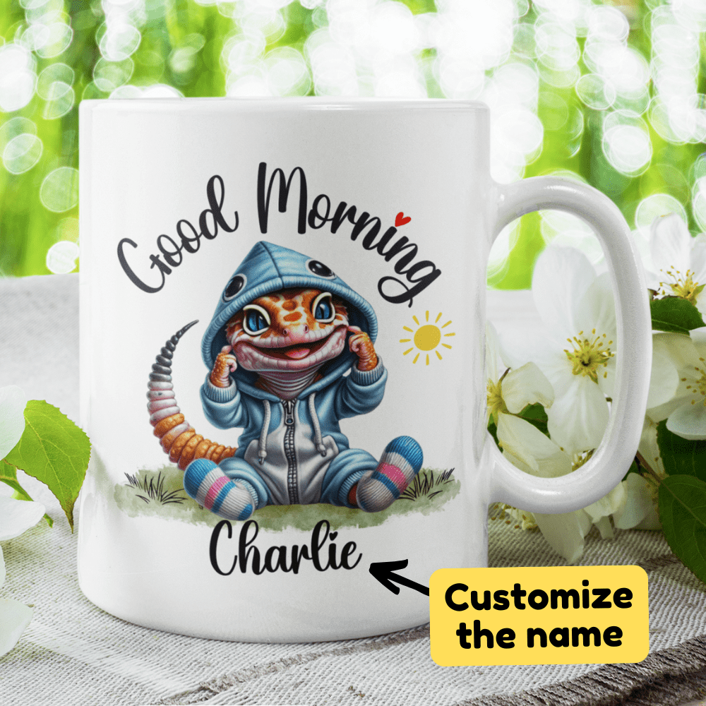 Brighten up your mornings with our "Good Morning" lizard coffee mug, perfect for anyone who holds a special place in their heart for these fascinating creatures. This delightful mug features a beautiful cartoon drawing of an adorable lizard, and you can customize it with your name or the name of a loved one right under the image, making each sip even more special.