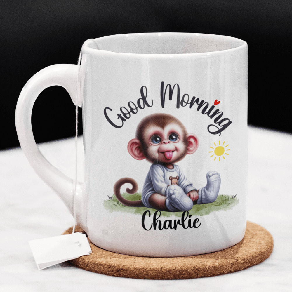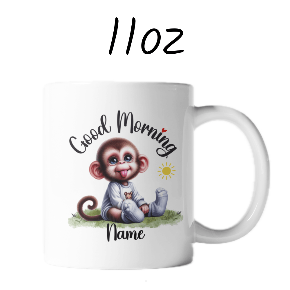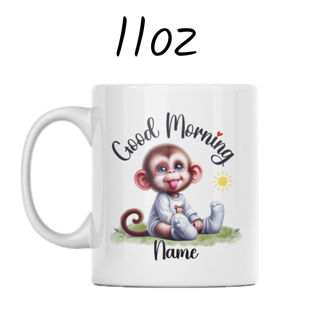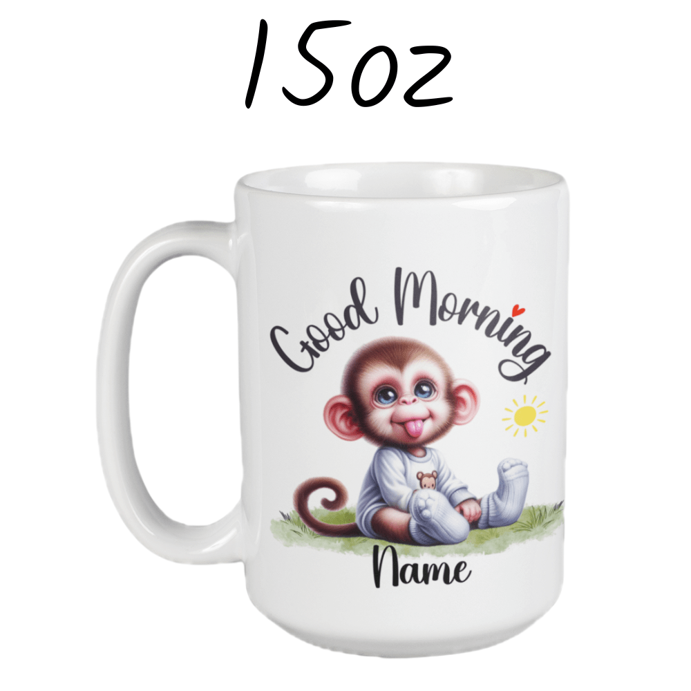 Swing into your day with our "Good Morning" monkey coffee mug! This delightful mug features a cheerful cartoon drawing of an adorable monkey, perfect for any monkey enthusiast. Personalize it with your name or a loved one's name right under the monkey image, making your morning coffee or tea a truly unique experience.