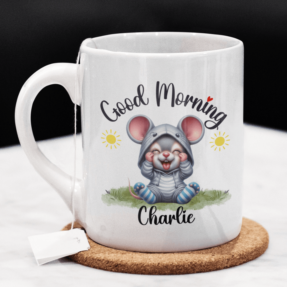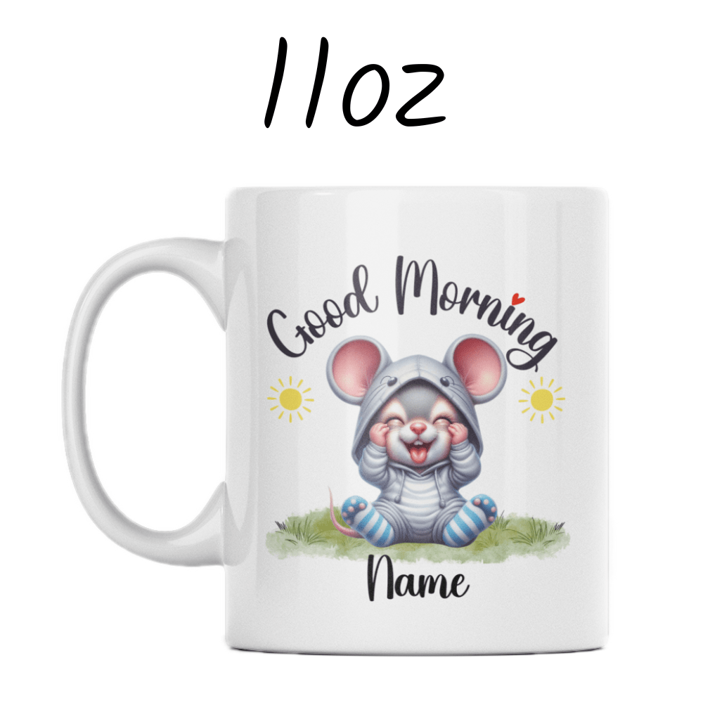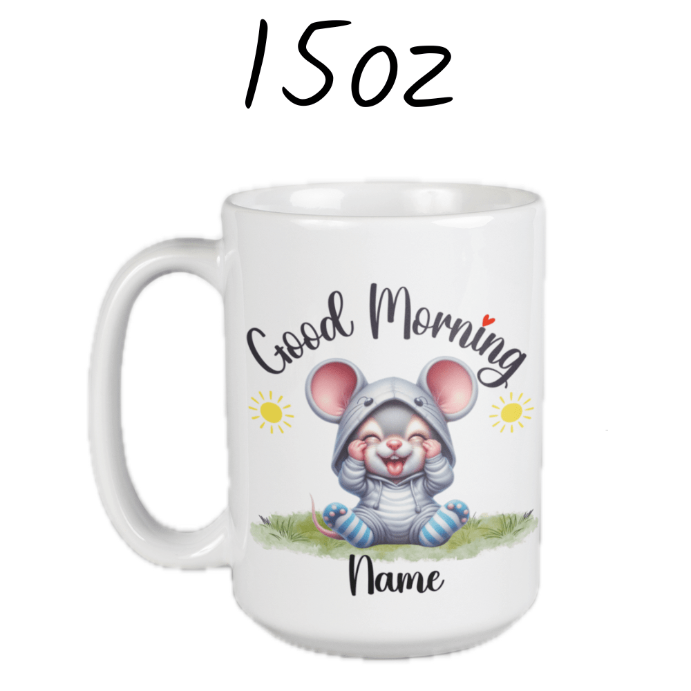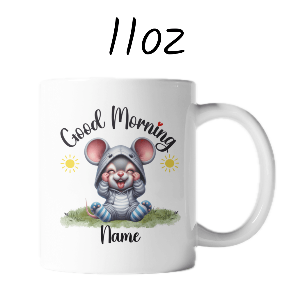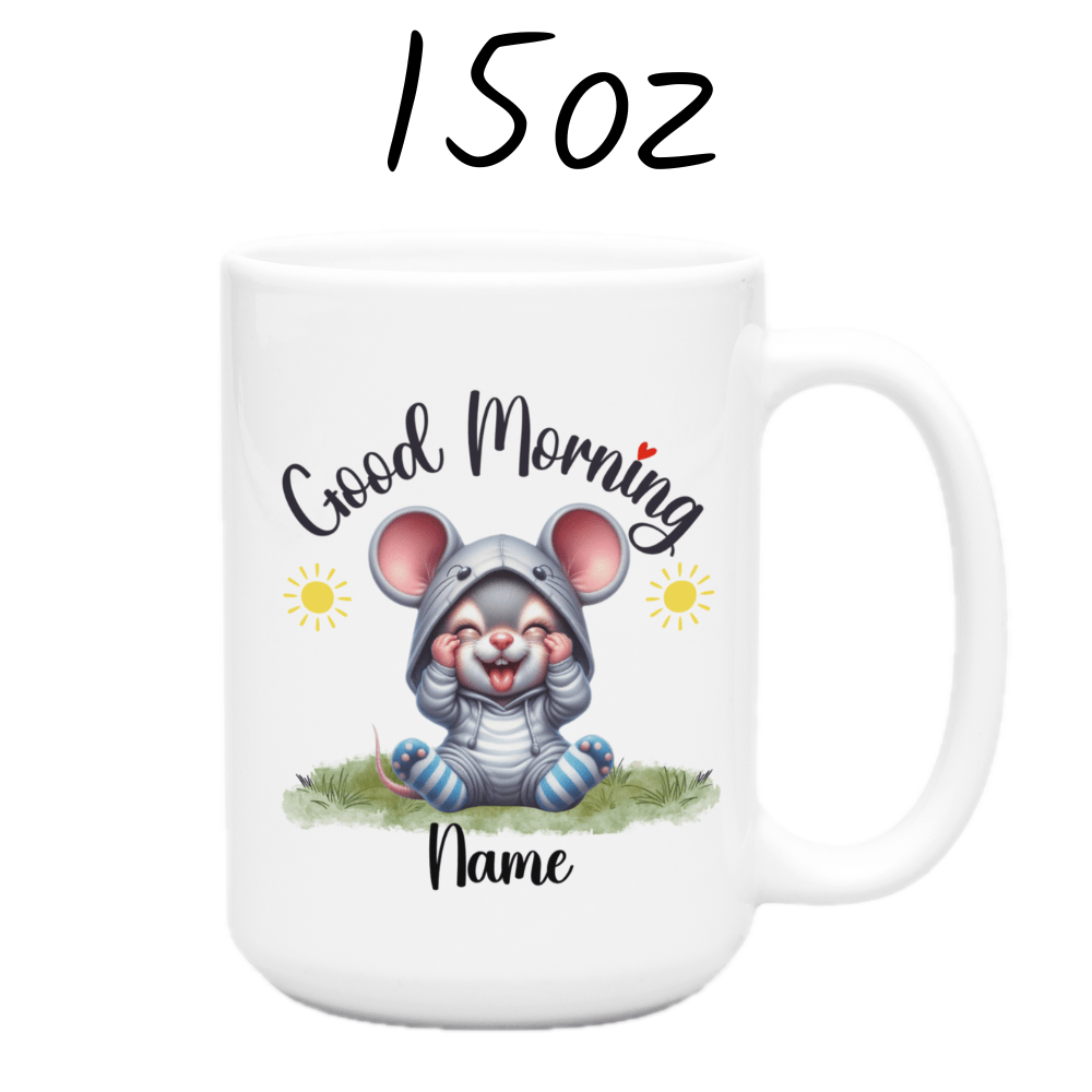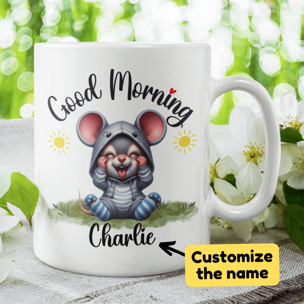 Start your day with the quiet charm of our "Good Morning" mouse coffee mug! This adorable mug features a beautifully cartooned mouse, ideal for anyone who adores these delightful little creatures. Plus, you can personalize it with a name right under the mouse illustration, making each morning's coffee or tea even more special.