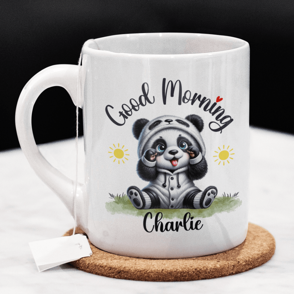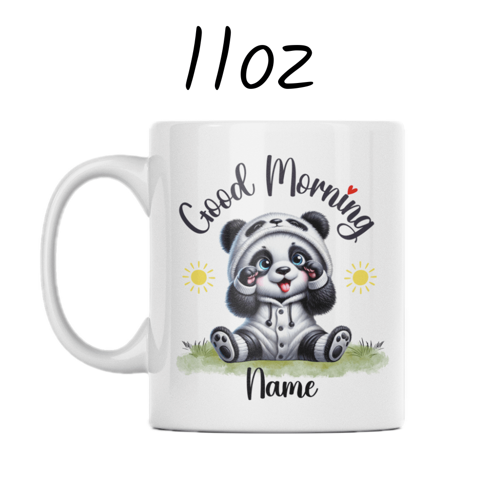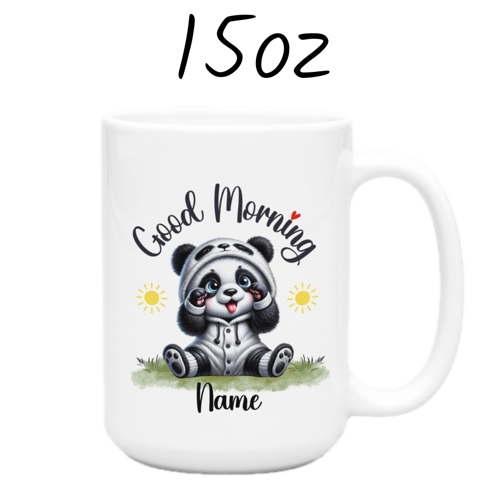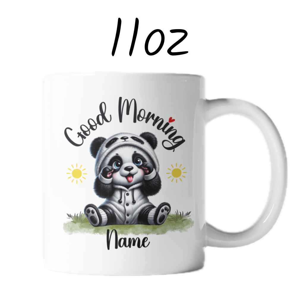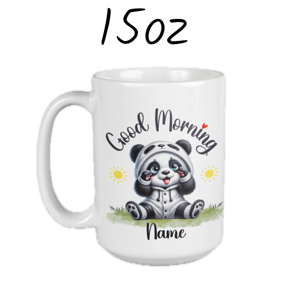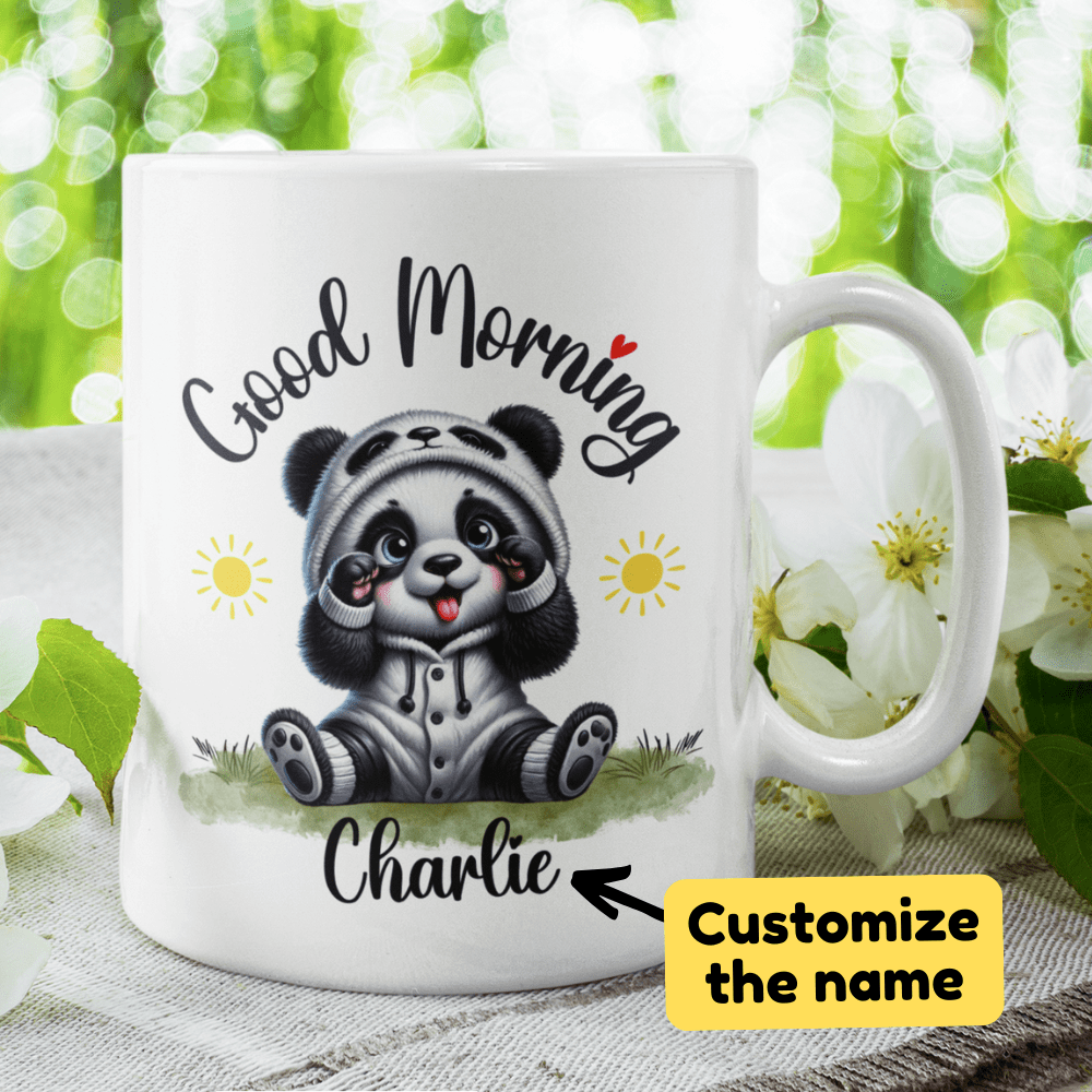 Start your day with the delightful charm of our "Good Morning" panda bear coffee mug! This mug features a beautiful cartoon drawing of an adorable panda, perfect for anyone who adores these peaceful and playful creatures. Customize it with your name or a loved one's name right under the panda image to make each morning even more special.