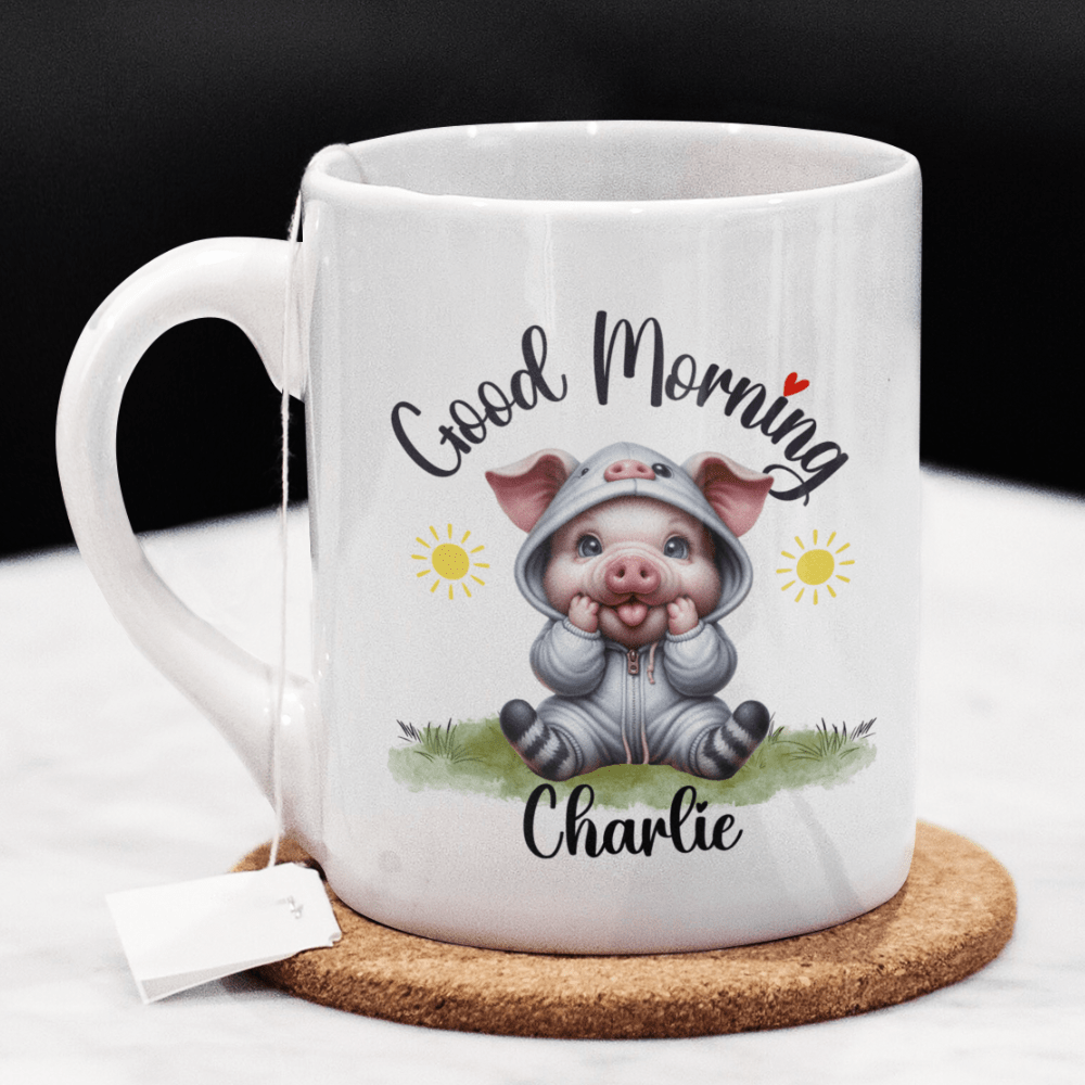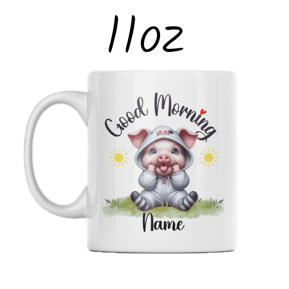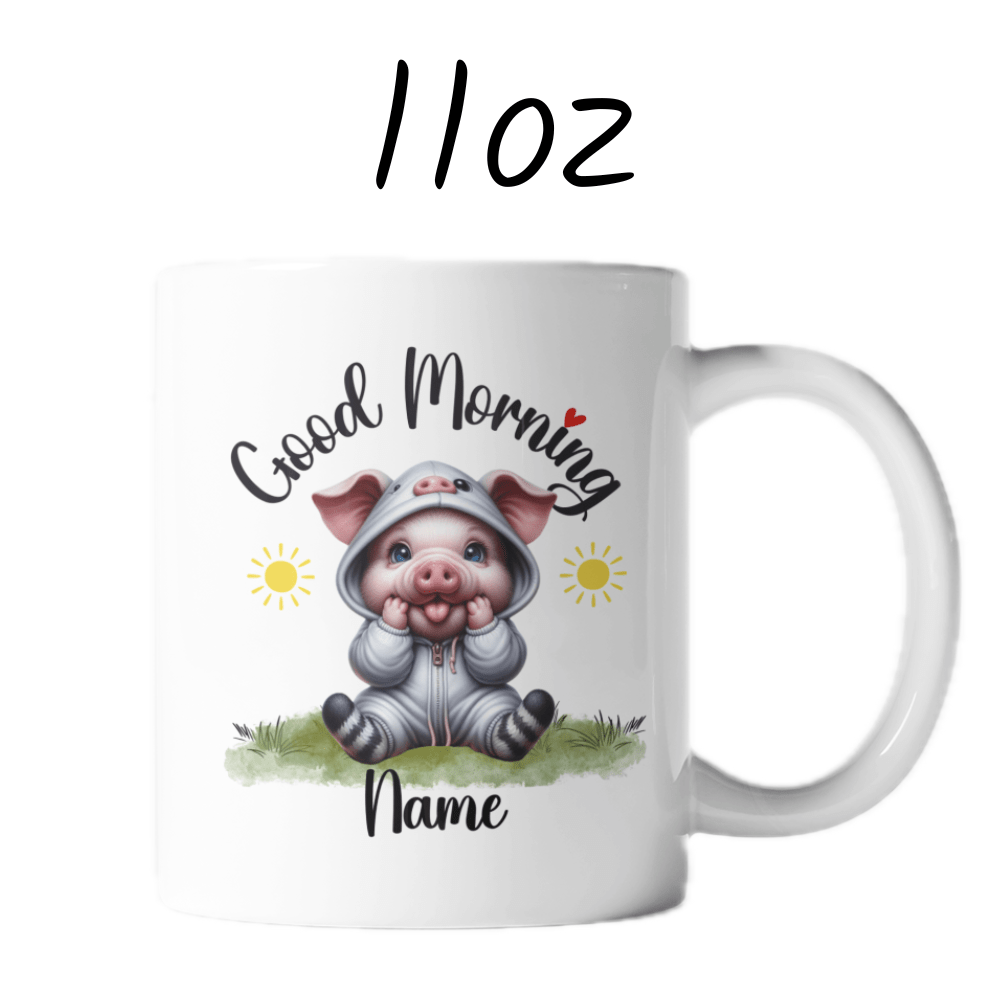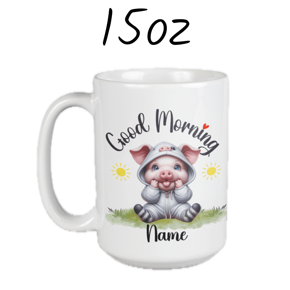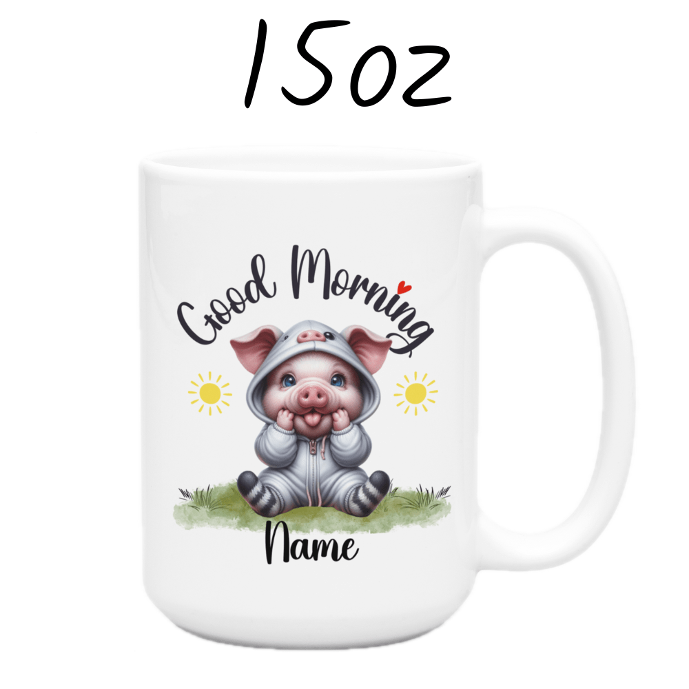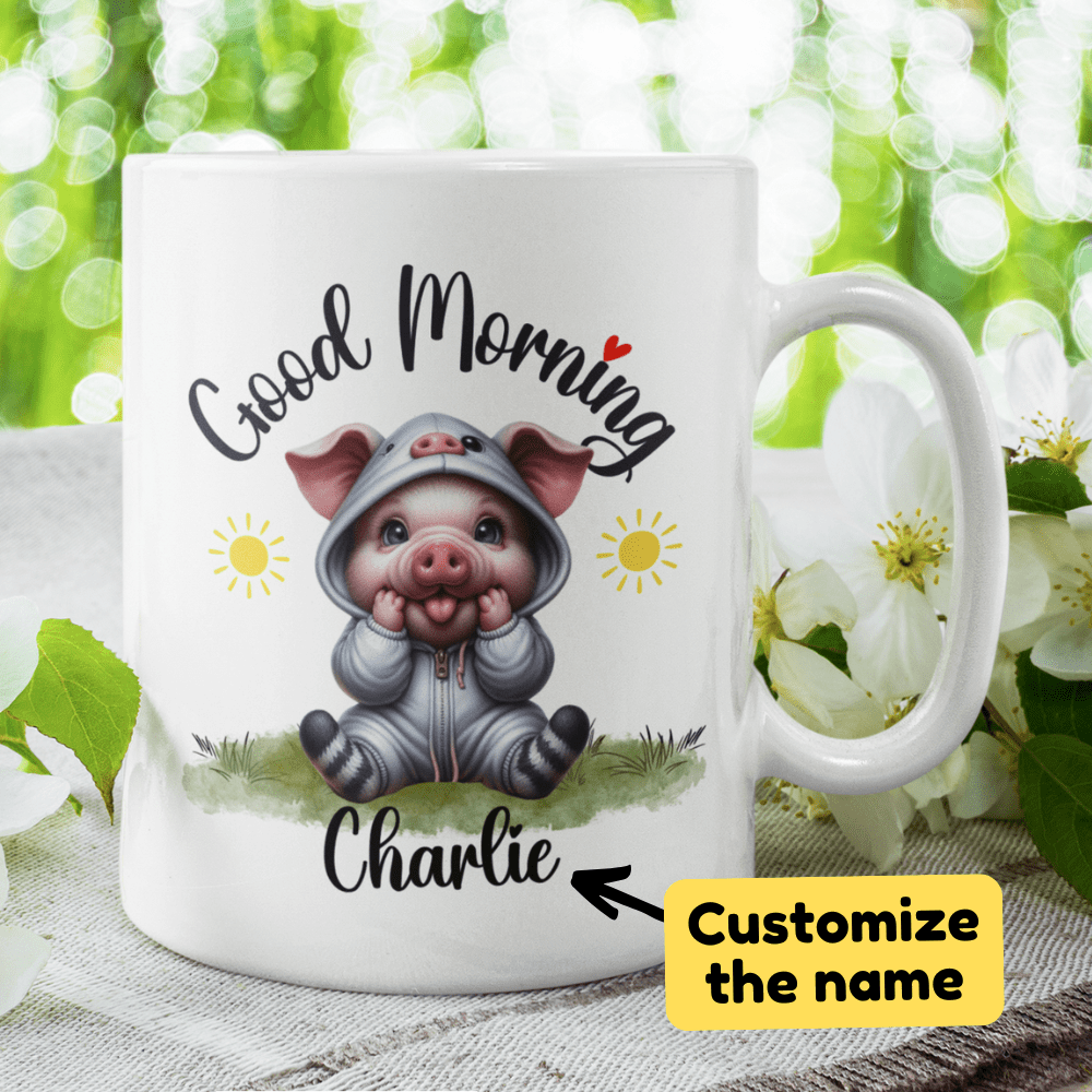 Wake up to a dose of delight with our "Good Morning" pig coffee mug! This adorable mug features a heartwarming cartoon drawing of a cheerful pig, perfect for any pig or piglet enthusiast. Customize it with your name or a loved one's name right under the pig illustration, making each morning's coffee or tea a personalized treat.
