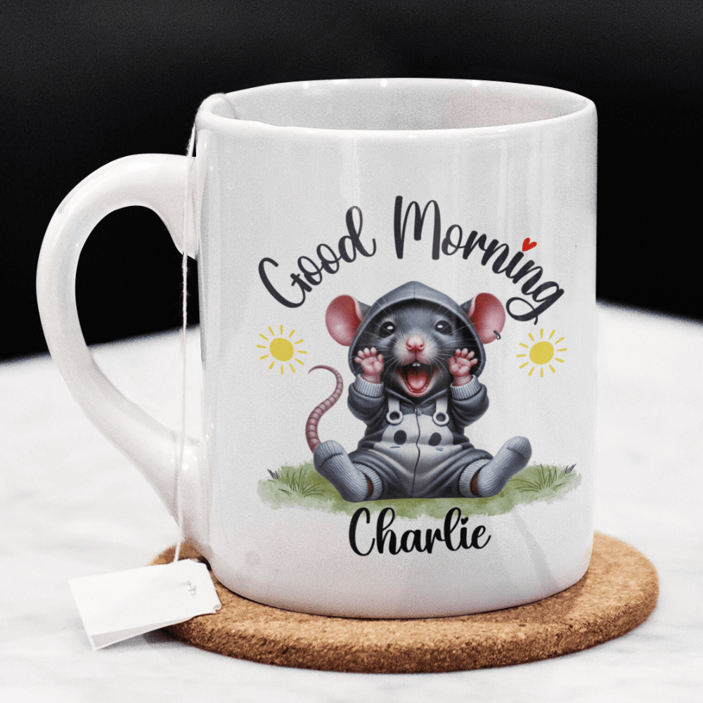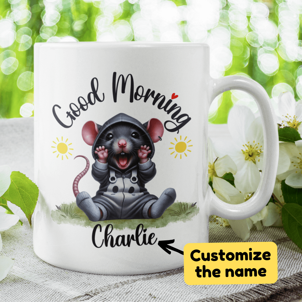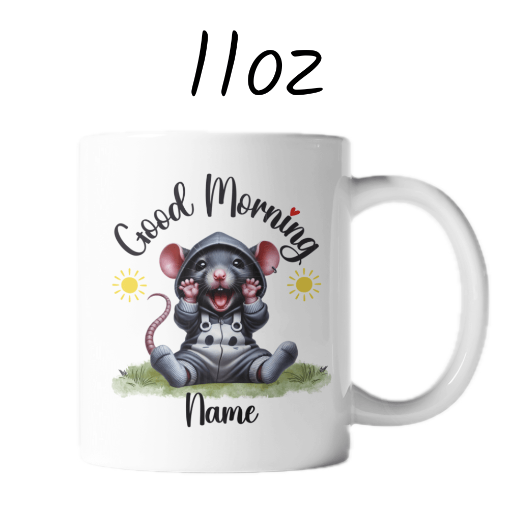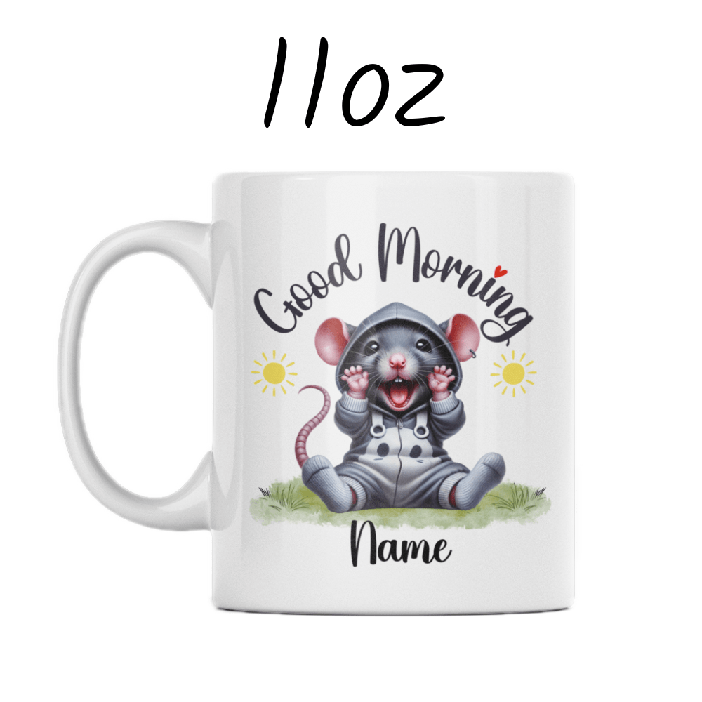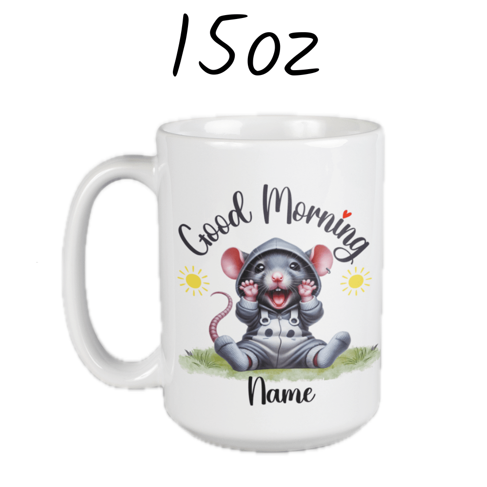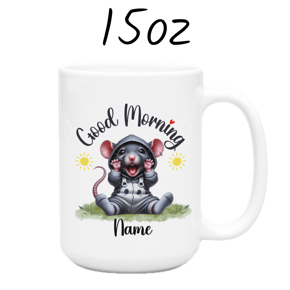 Start your day with a clever twist using our "Good Morning" rat coffee mug! This delightful mug features a cute cartoon drawing of an adorable rat, making it the perfect pick for anyone who appreciates these smart and resourceful creatures. Customize it with your name or a loved one's name right under the rat image, personalizing your morning ritual.