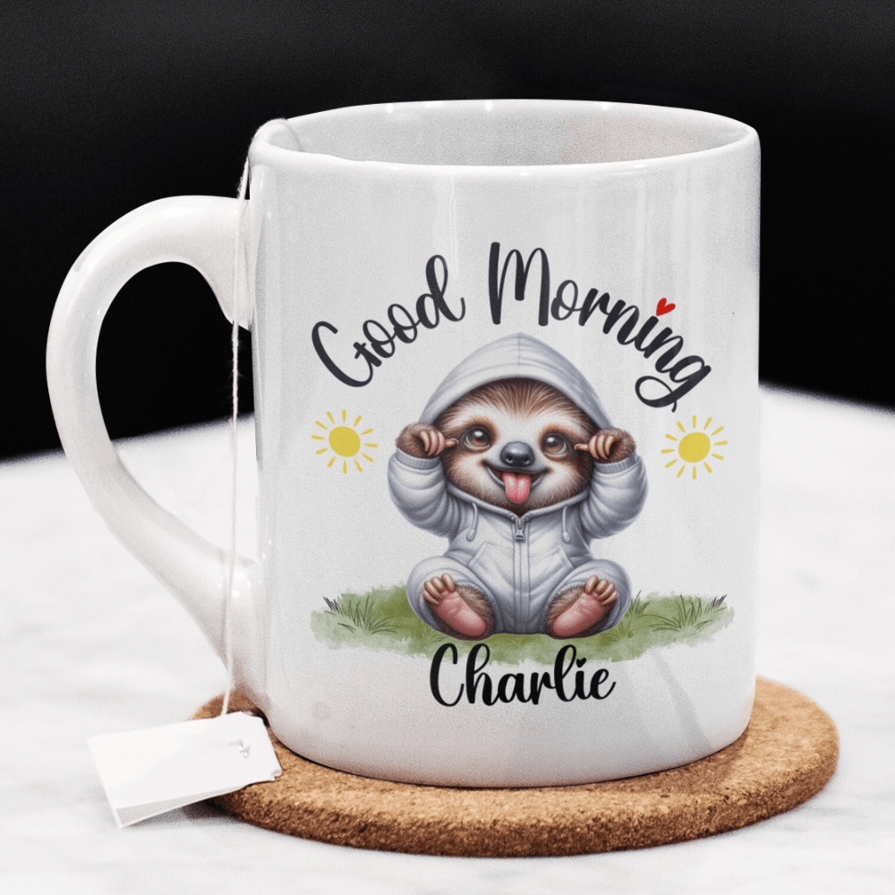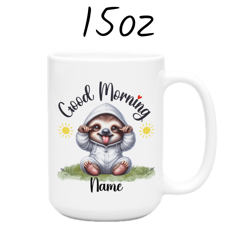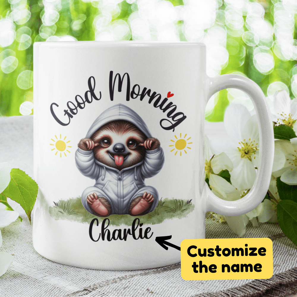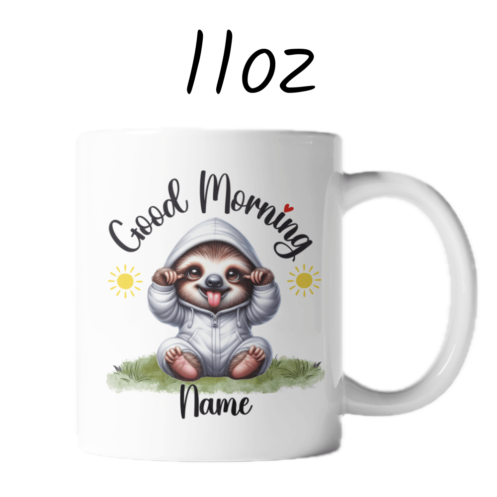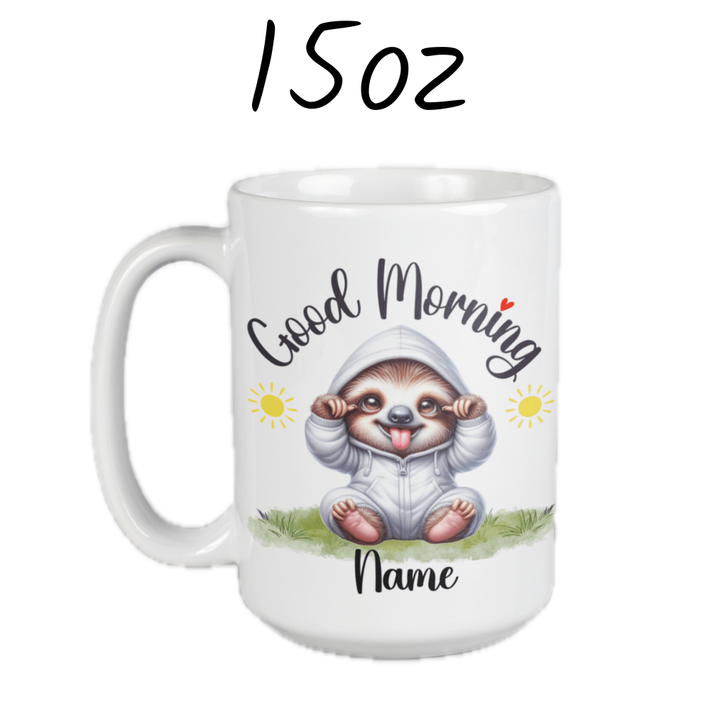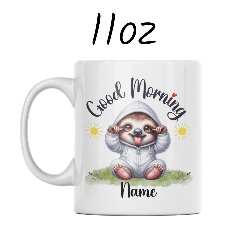Ease into your day with the laid-back charm of our "Good Morning" sloth coffee mug! This adorable mug features a serene cartoon drawing of a sloth, perfect for anyone who appreciates life's slower moments. Personalize it with your name or a loved one's name right under the sloth image, making every morning a personalized, peaceful retreat.