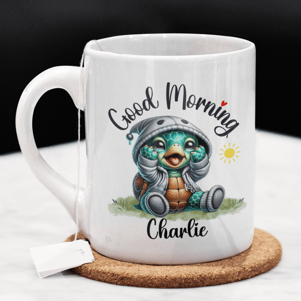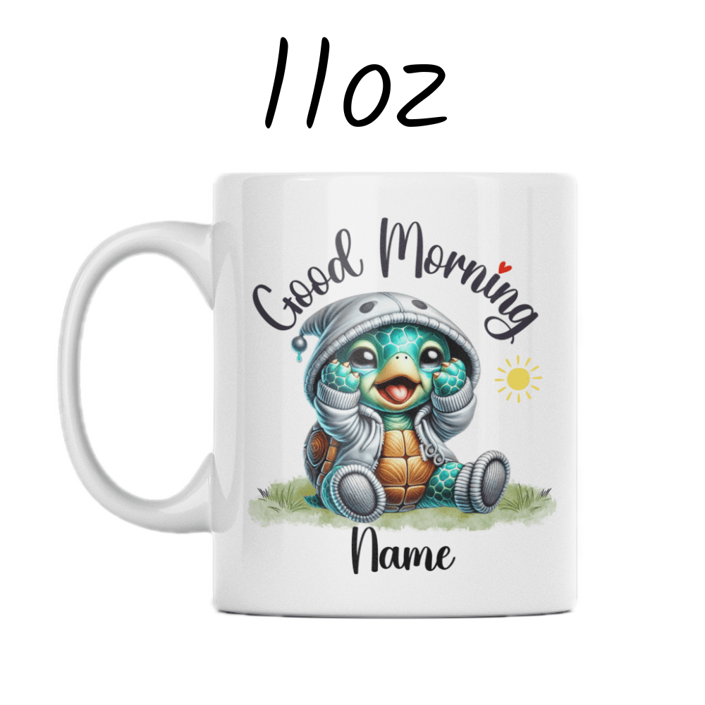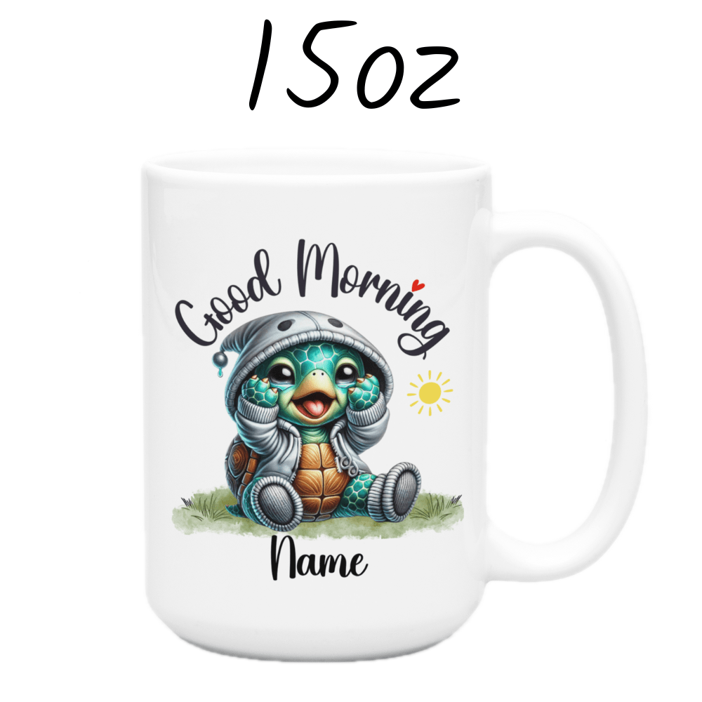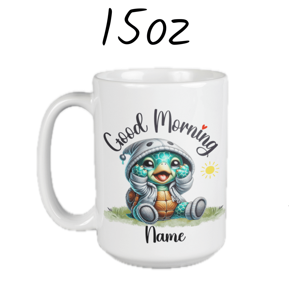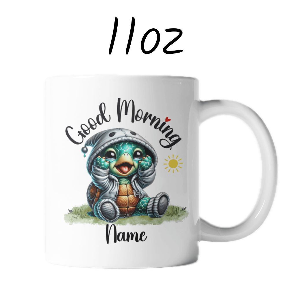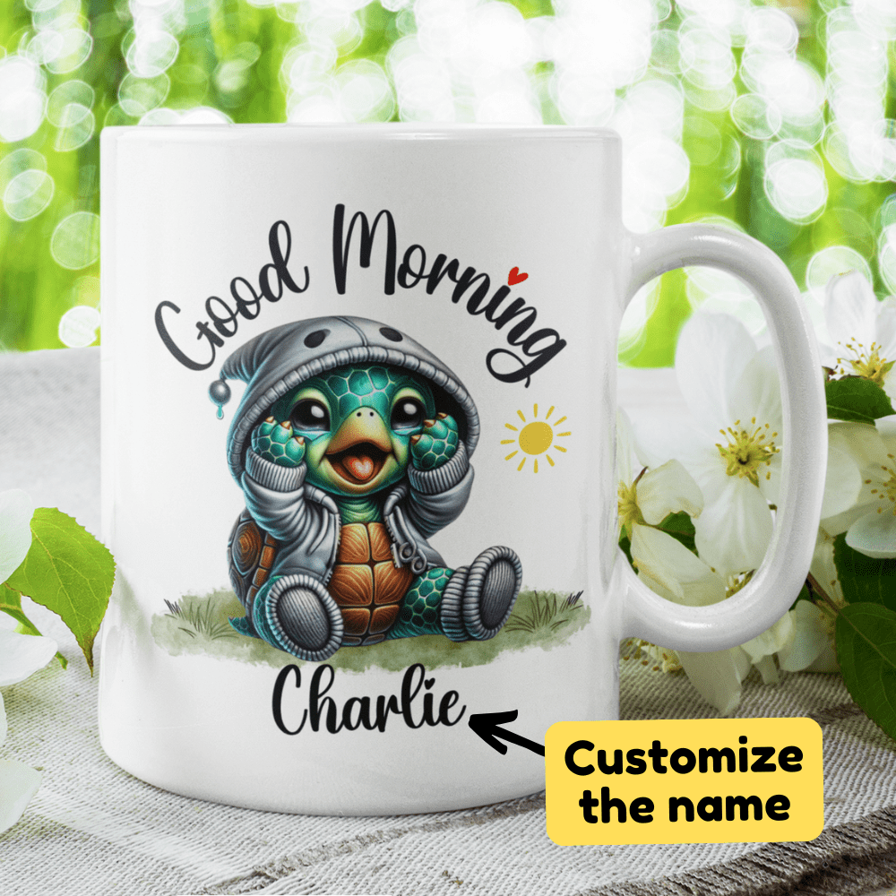 Start your day at a peaceful pace with our "Good Morning" turtle coffee mug! This delightful mug features a charming cartoon drawing of a serene turtle, perfect for anyone who admires these wise and enduring creatures. Personalize it with your name or a loved one's name right under the turtle illustration, making each morning's coffee or tea a truly tranquil experience.