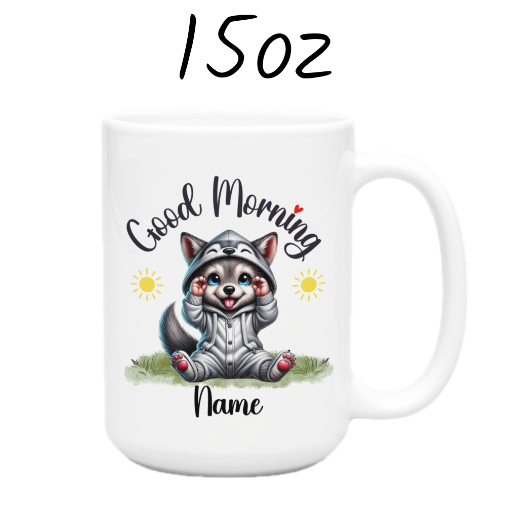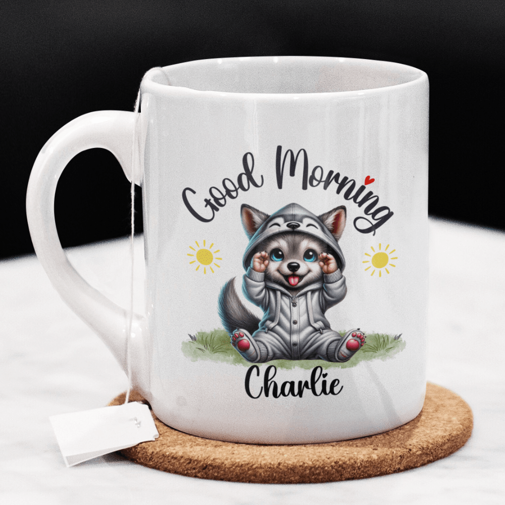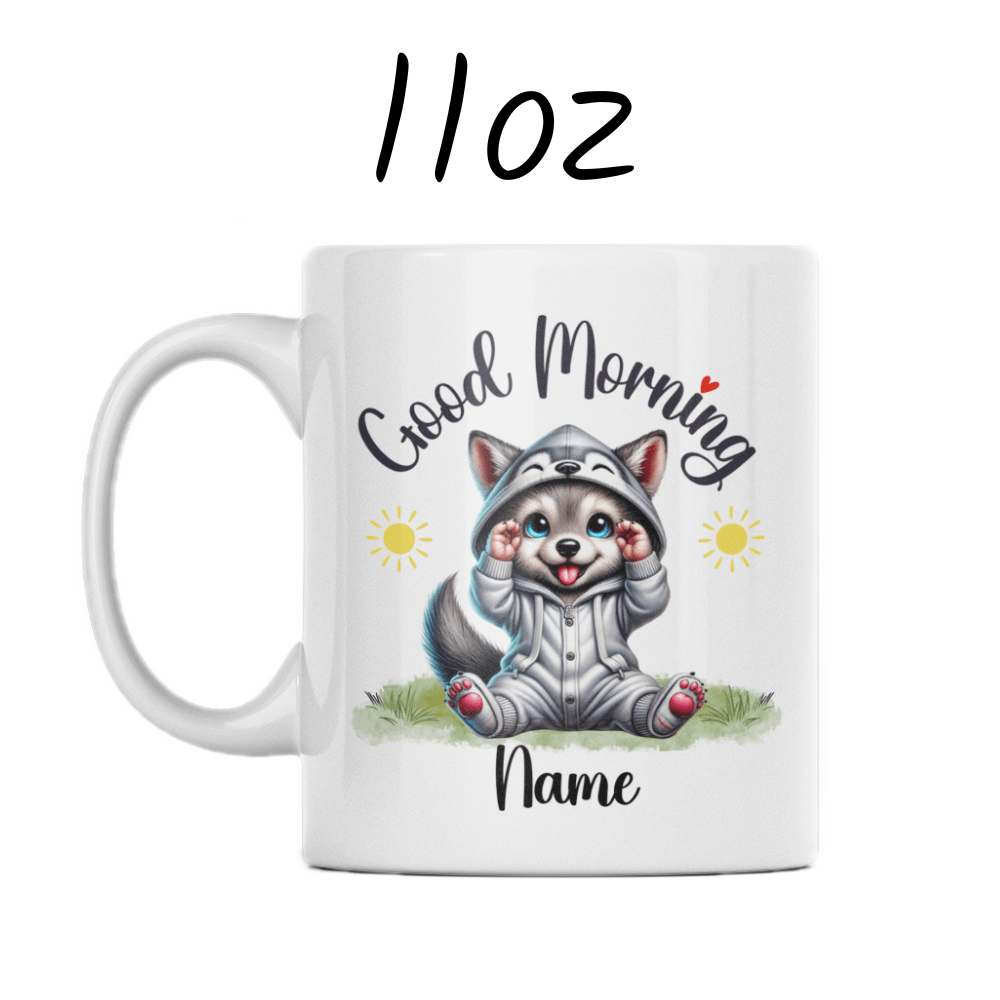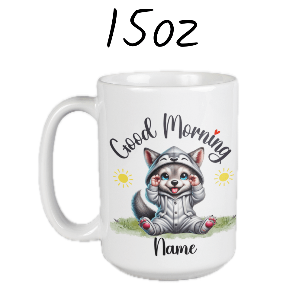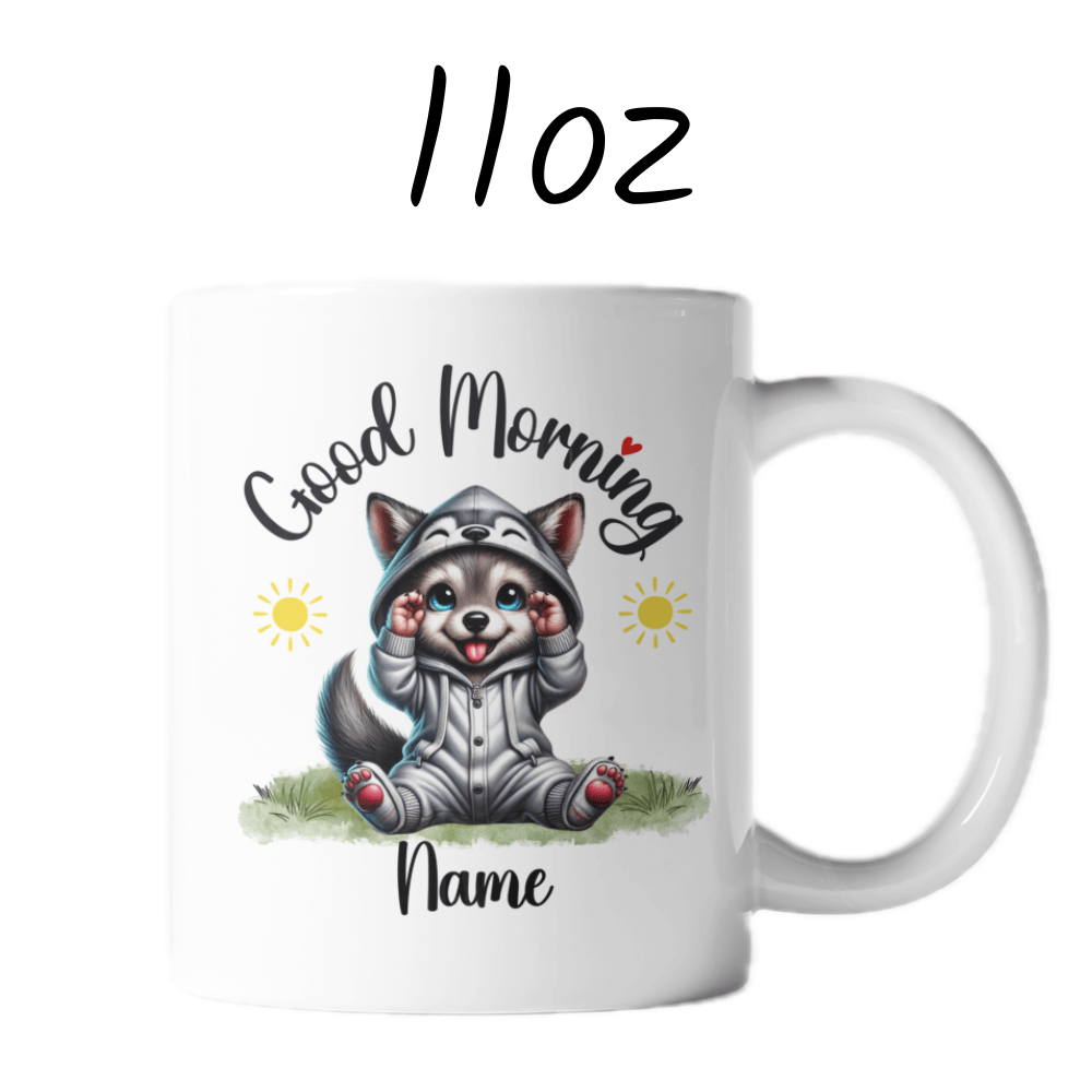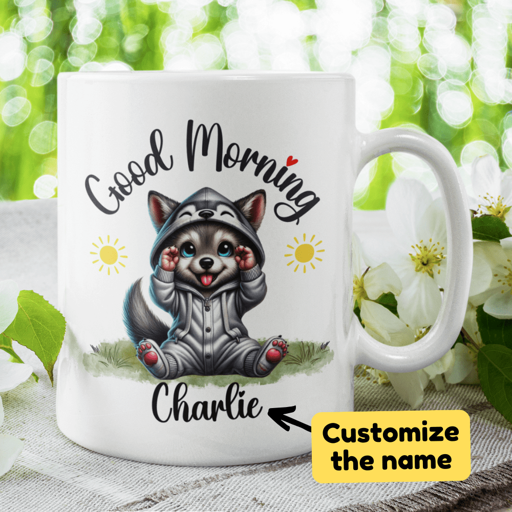 Embrace the spirit of the wilderness with our "Good Morning" wolf coffee mug! This captivating mug features a beautiful cartoon drawing of an adorable wolf, perfect for anyone who admires the strength and mystique of these majestic creatures. Customize it with your name or a loved one's name right under the wolf image, making each morning's brew a personalized journey into the wild.