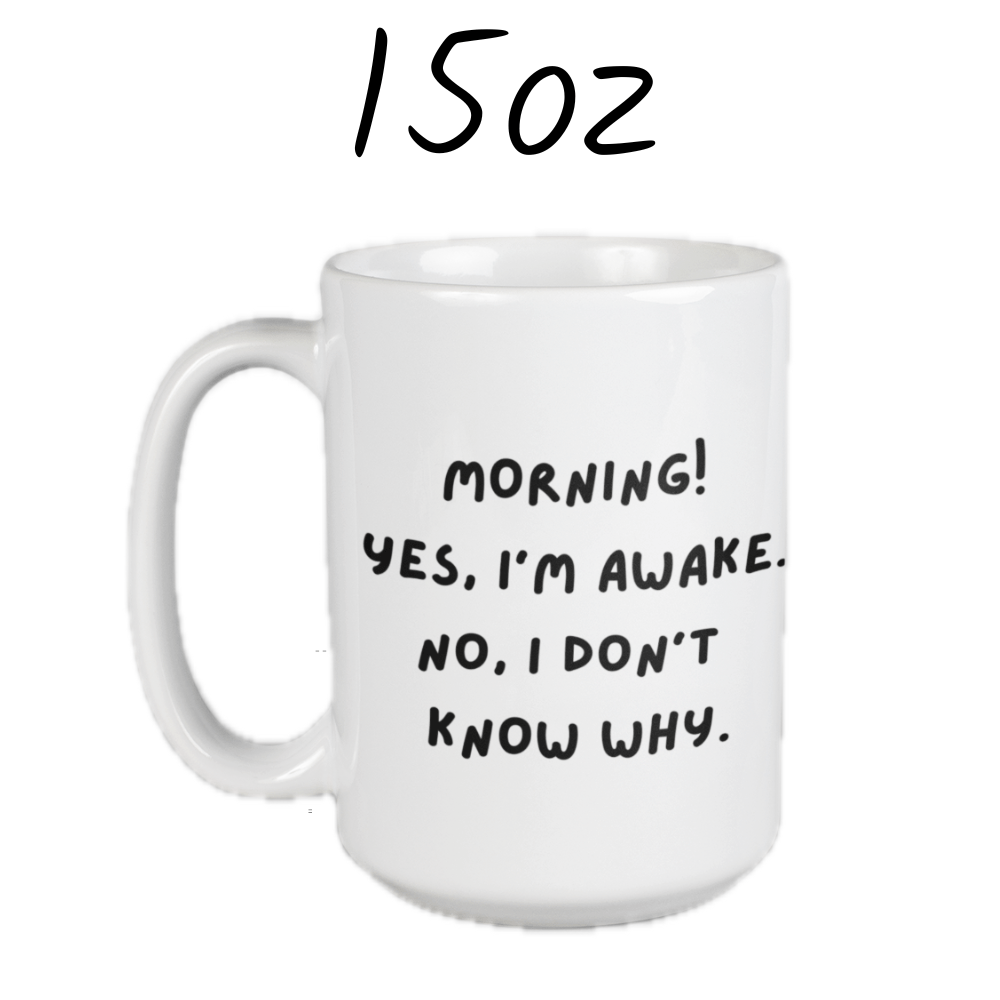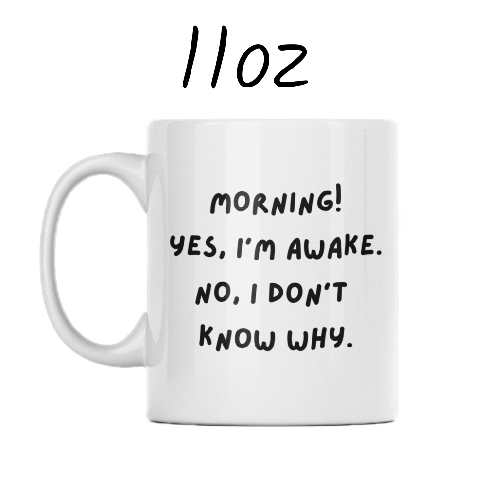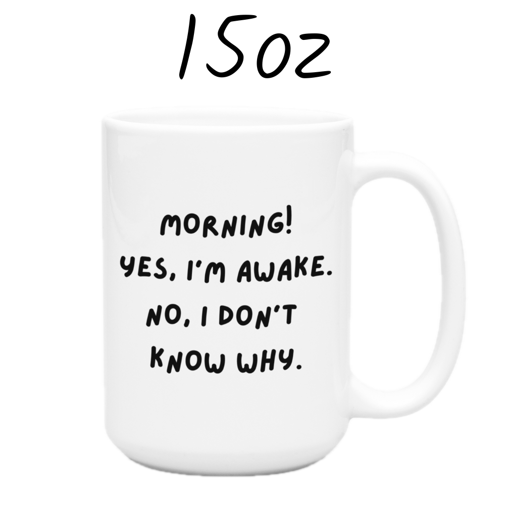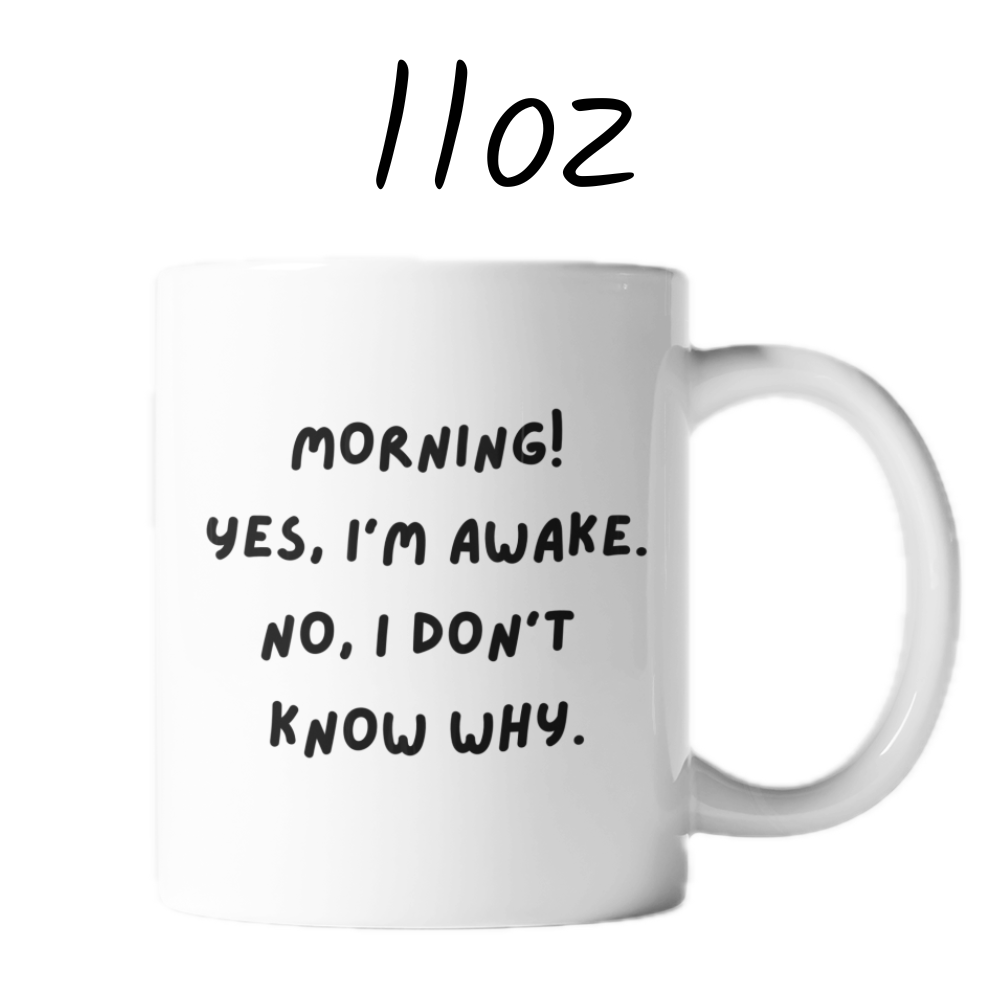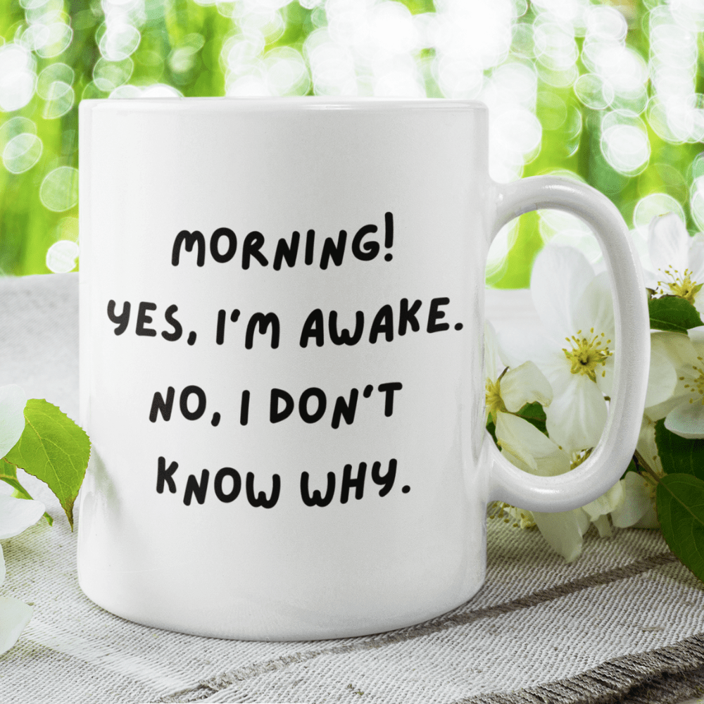 Perk up your morning (sort of) with our "Morning! Yes, I'm awake. No, I don't know why." coffee mug! This mug, adorned with a humorously sarcastic quote, captures the essence of early morning bewilderment and is perfect for anyone who faces the dawn with a mix of humor and mystification.