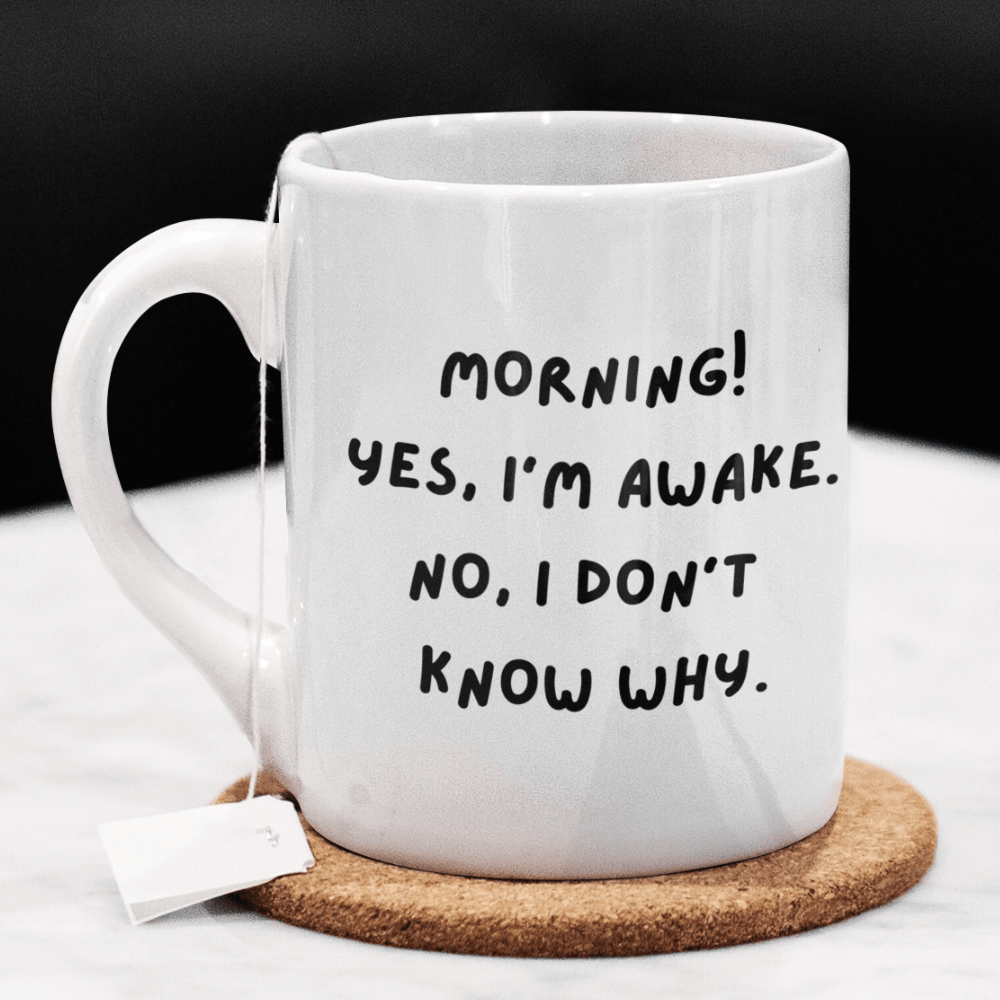 With our "Morning! Yes, I'm awake. No, I don't know why." coffee mug, begin your day with a nod to the absurdity of early mornings. Personalize your or a loved one’s morning routine with a mug that combines practicality with a good laugh, reminding everyone that it’s okay to be a little bewildered first thing in the morning.