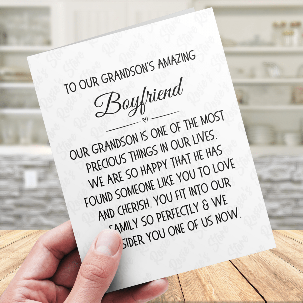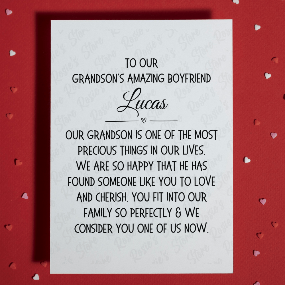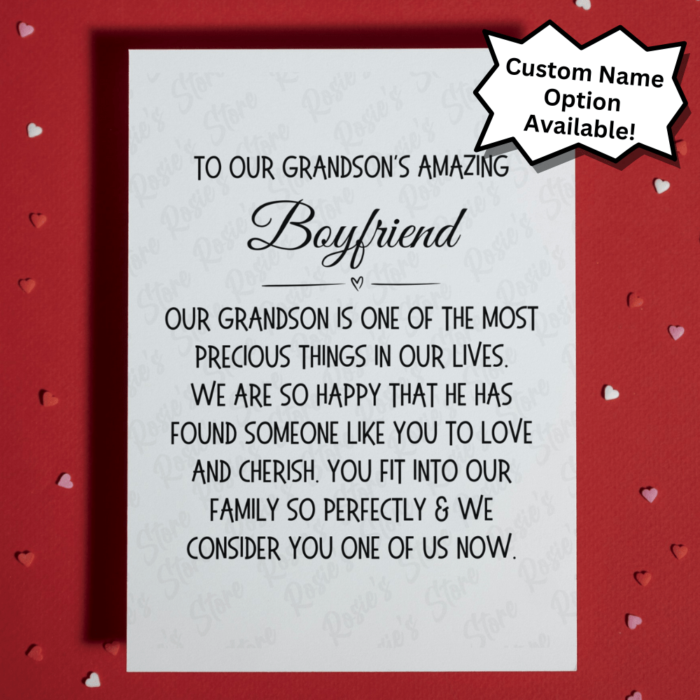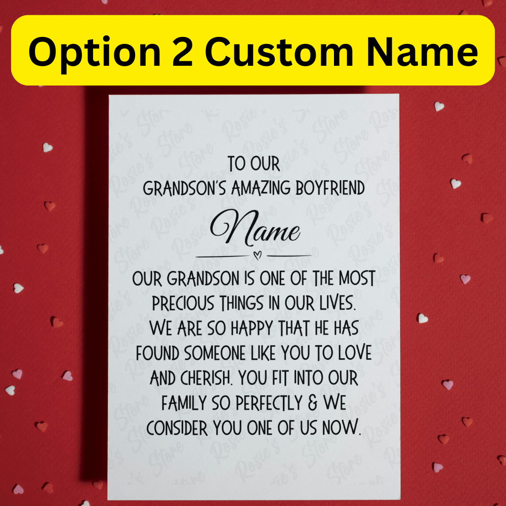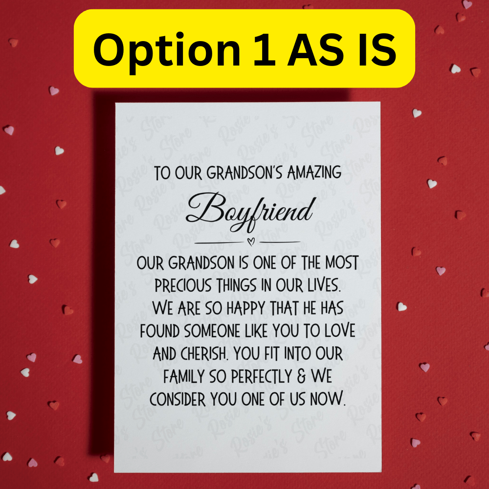 Introducing our heartfelt greeting card: "To our grandson’s amazing Boyfriend. Our grandson is one of the most precious things in our lives. We are so happy that he has found someone like you to love and cherish. You fit into our family so perfectly & we consider you one of us now." This card comes with two options: Option 1 AS IS, or Option 2, which can be customized with the grandson's boyfriend's name, making it a truly special and personal gift.