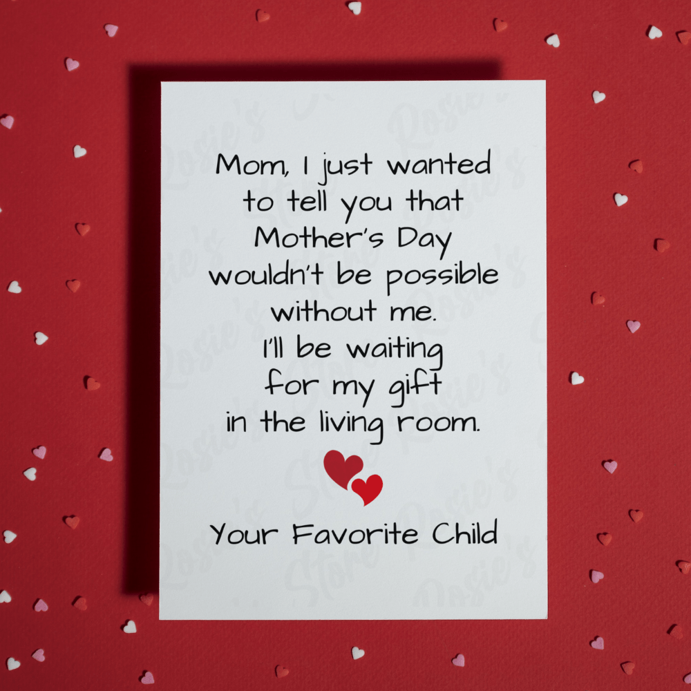- Front Cover: Features the humorous message, "Mom, I just wanted to tell you that Mother's Day wouldn't be possible without me. I'll be waiting for my gift in the living room. Your Favorite Child." This light-hearted jab is sure to tickle her funny bone, making it clear who the real star of the day should be.