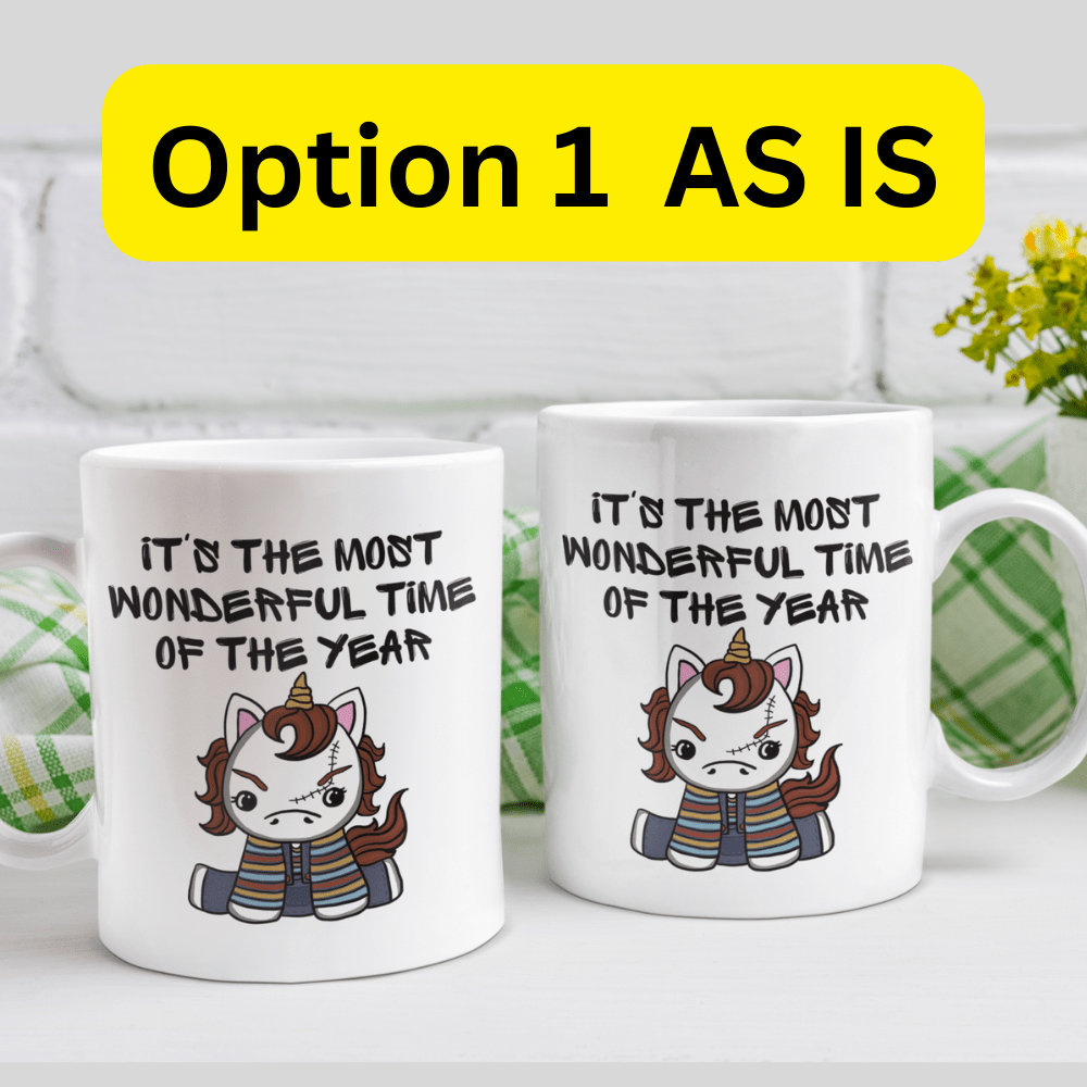 Celebrate the spookiest season with a twist of fantasy and horror with our white ceramic coffee mug, exclaiming "It's the most wonderful time of the year" alongside a quirky cartoon drawing of a Unicorn Chuckie. This unique mug melds the magic of unicorns with the iconic horror character for a truly original Halloween statement.