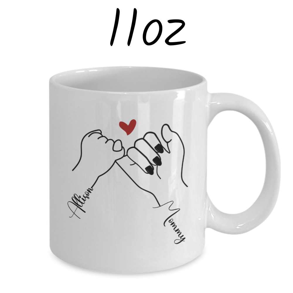 Customizable: Make this mug uniquely yours. The front showcases an endearing cartoon drawing of a mother and daughter gazing at the universe, accompanied by the heartfelt quote, "I love you beyond the whole universe." On the back, their bond is immortalized with a customizable pinky swear. Add their names to both hands, transforming each sip into a reminder of your special connection.