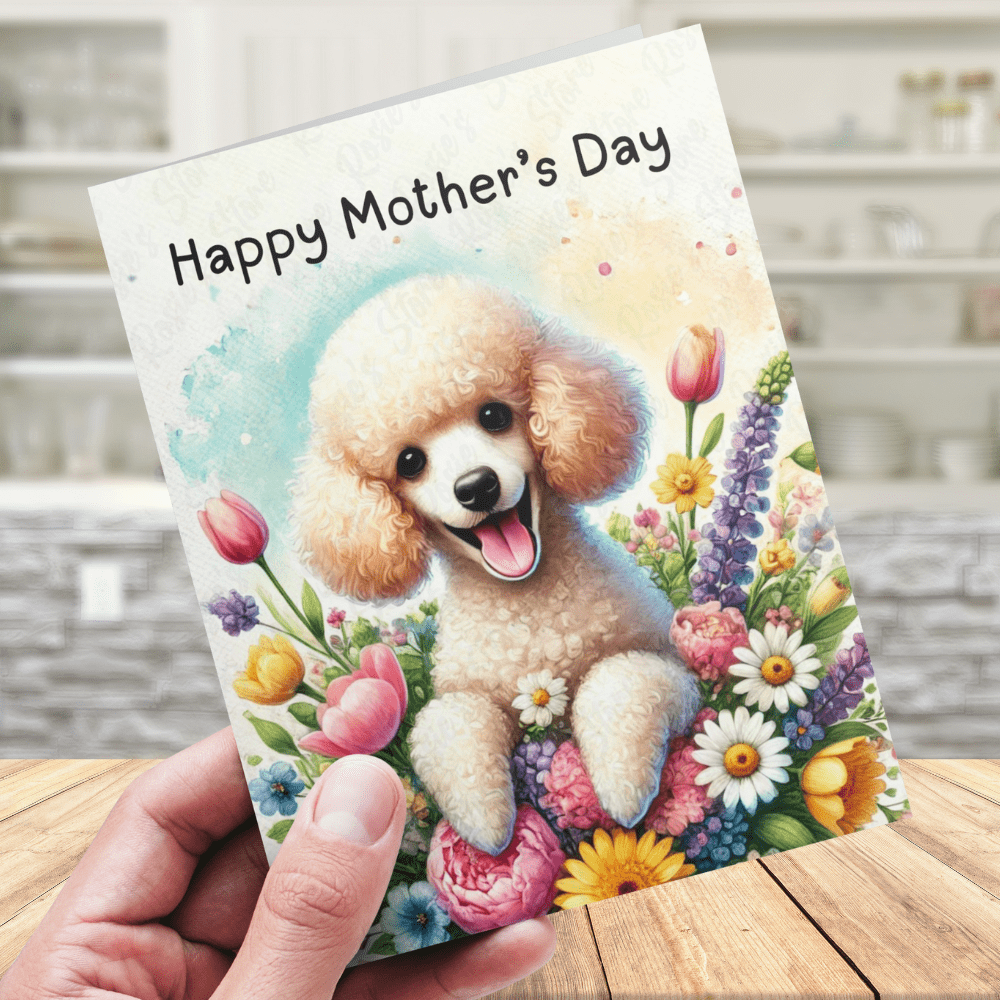 Design: Features a sweet watercolor illustration of a Poodle dog peeking out from a bed of beautiful spring flowers, radiating charm, love, and eleganceājust like Mom!