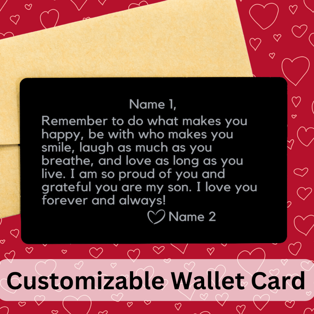 The profound message engraved onto this card is, "Name 1, Remember to do what makes you happy, be with who makes you smile, laugh as much as you breathe, and love as long as you live. I am so proud of you and grateful you are my son. (Please note that you can change 'son' for anything you'd like to. For example grandson, bonus son, nephew, etc.) I love you forever and always! Name 2" encapsulates the essence of love, encouragement, and gratitude. You have the opportunity to personalize this card by adding the names of your choice, making it a truly unique and meaningful keepsake. Please ensure your spelling/grammar before sending us your text. We are NOT responsible for mistakes you have made in spelling/grammar.