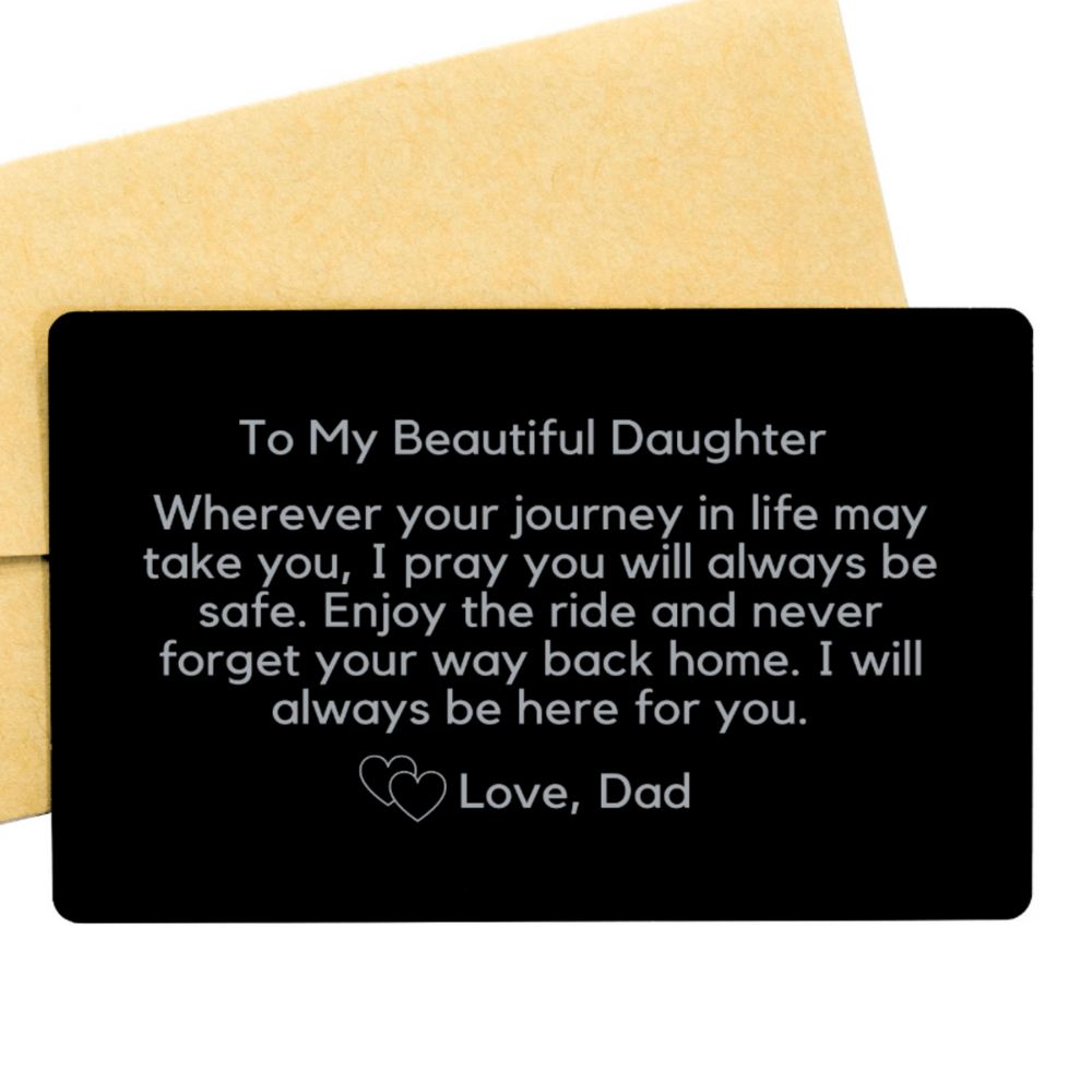 The profound message engraved onto this card reads, "To my beautiful daughter. Wherever your journey in life may take you, I pray you will always be safe. Enjoy the ride and never forget your way back home. I will always be here for you. Love, Dad". As an option, you have the opportunity to personalize this card with names or text of your choice, making it a truly personalized and heartfelt keepsake. Please be sure of your spelling/grammar before you send us your text. We are NOT responsible for mistakes you have made in spelling/grammar.