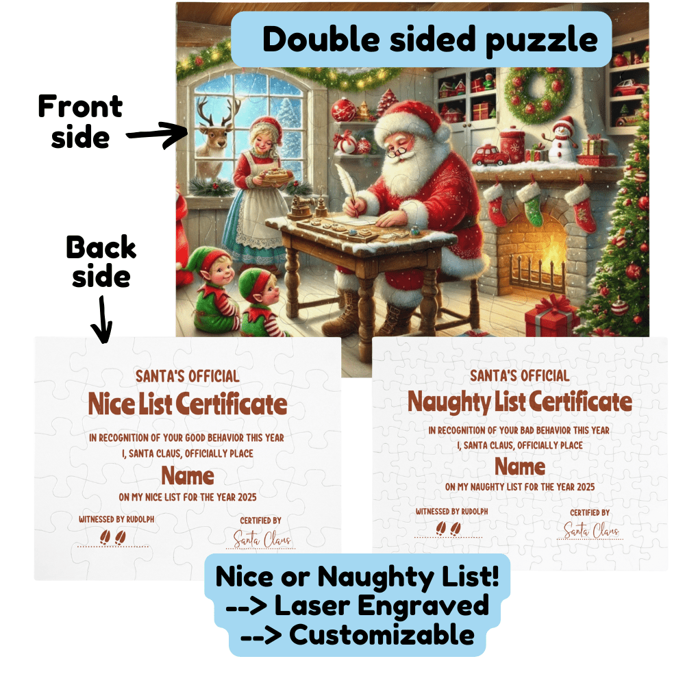 Make the holiday season extra magical with our Double-Sided Jigsaw Puzzle – Nice or Naughty List Certificate from Santa Claus! This isn't just any kids puzzle; it's a unique and fun kids activity that doubles as a special keepsake from the North Pole.