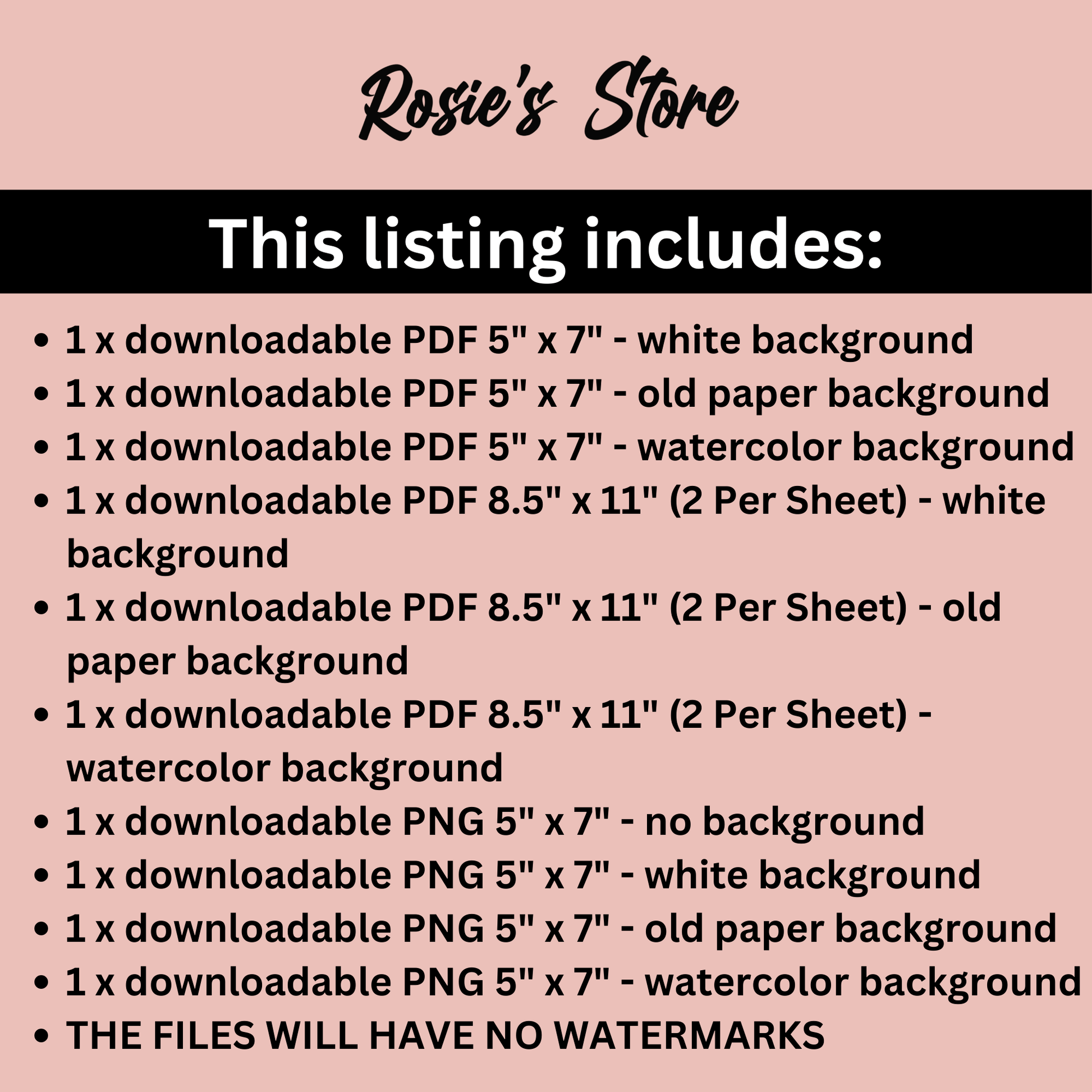 One 5" x 7" PNG file with an elegant old paper background, adding a vintage touch.