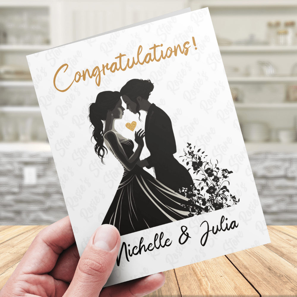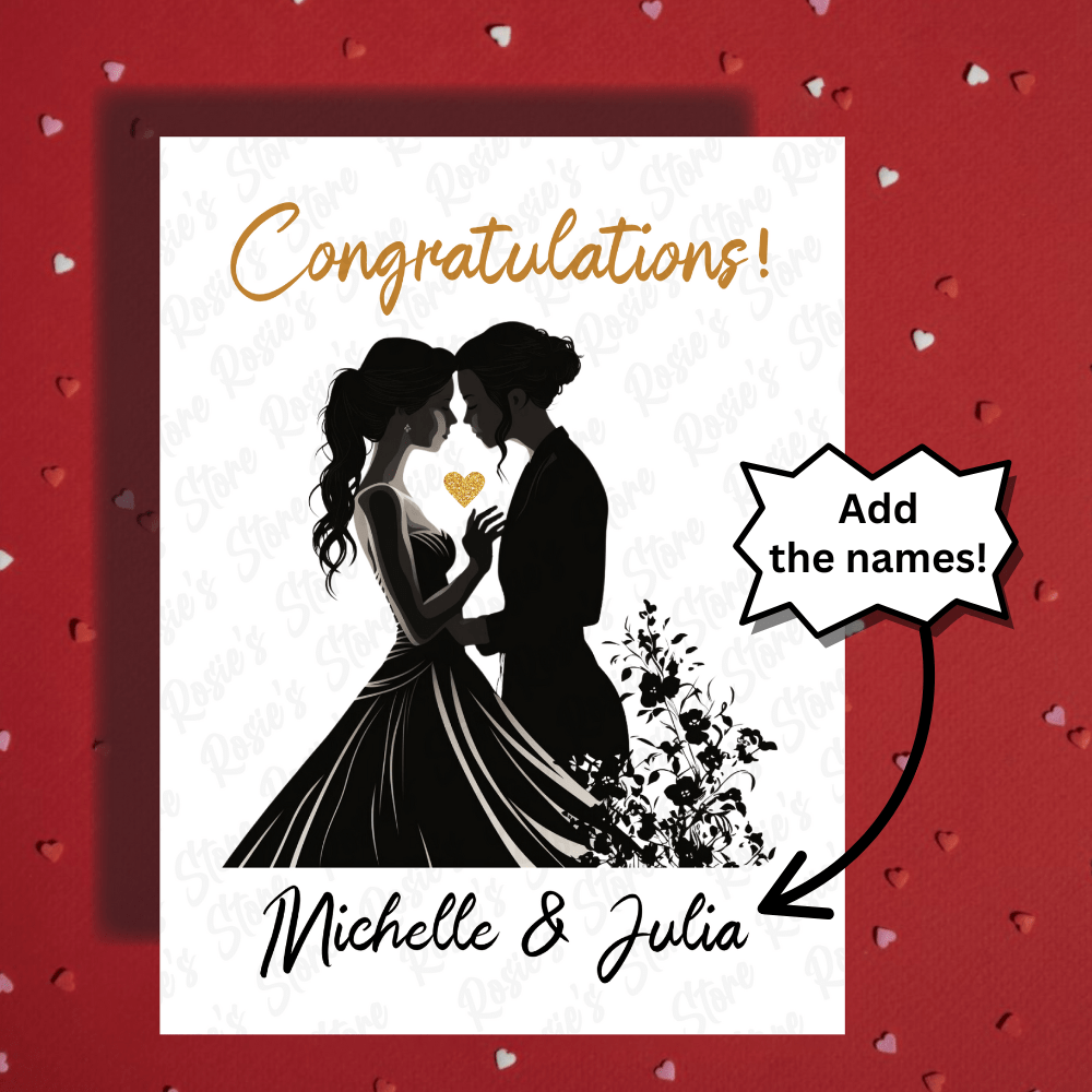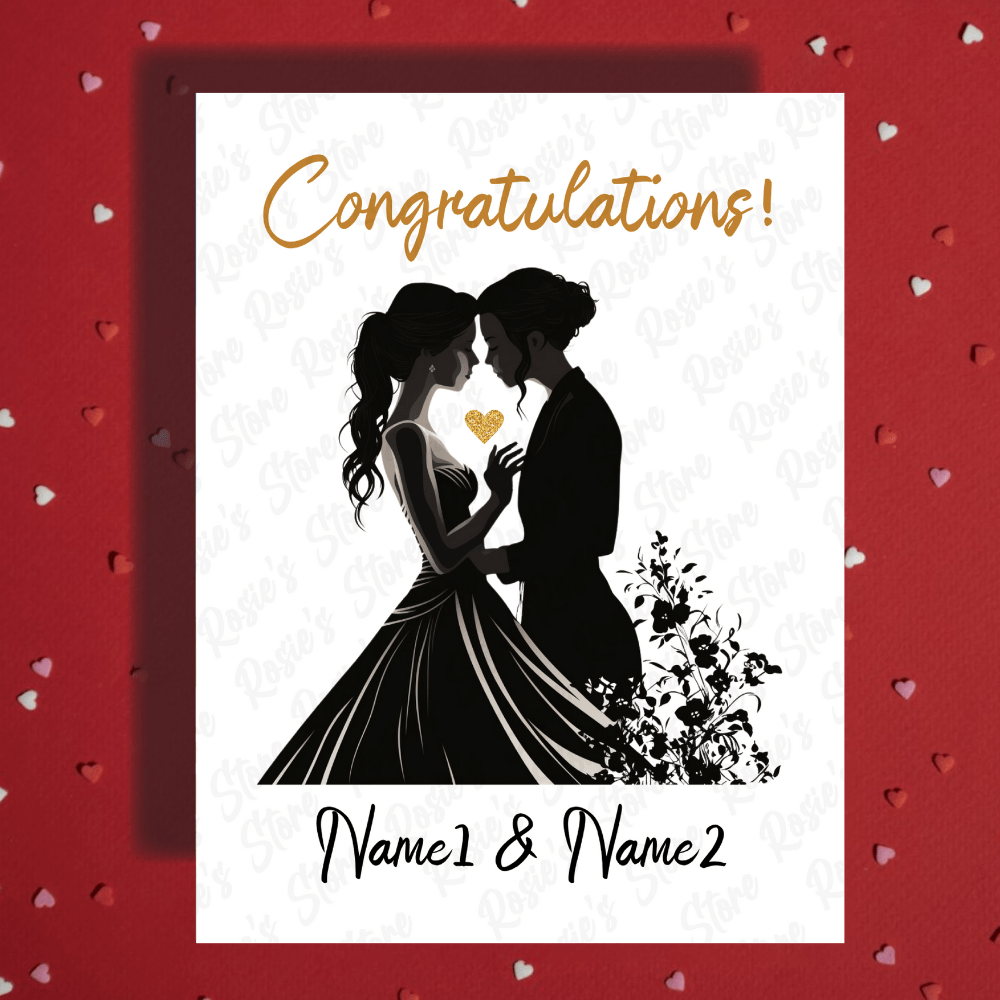 Celebrate the love and joy of a happy couple on their special day with our exquisite wedding greeting card. This card, measuring 4.25" x 5.5", features a beautifully crafted silhouette drawing of two brides, with space for the names of the newlyweds underneath.