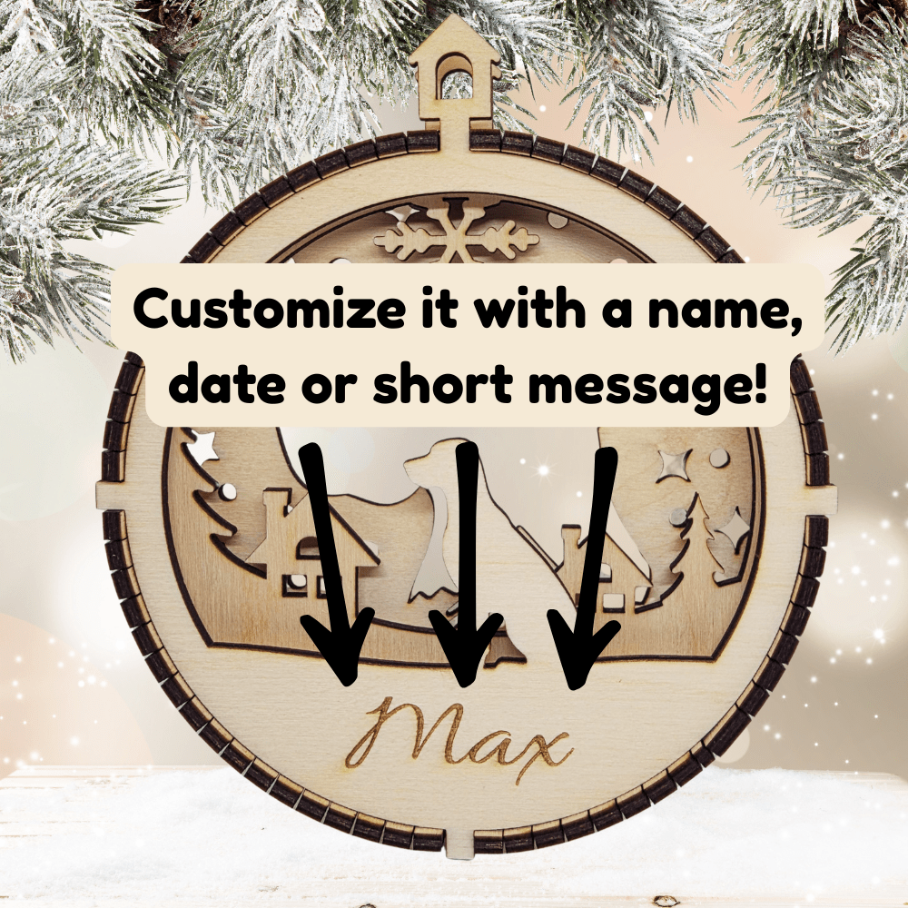 Crafted with a three-layer structure, separated by a fine wooden band, this ornament creates a striking illusion of depth and three-dimensional detail — a stunning piece of handmade Christmas tree decor that adds warmth and character to your home.