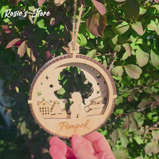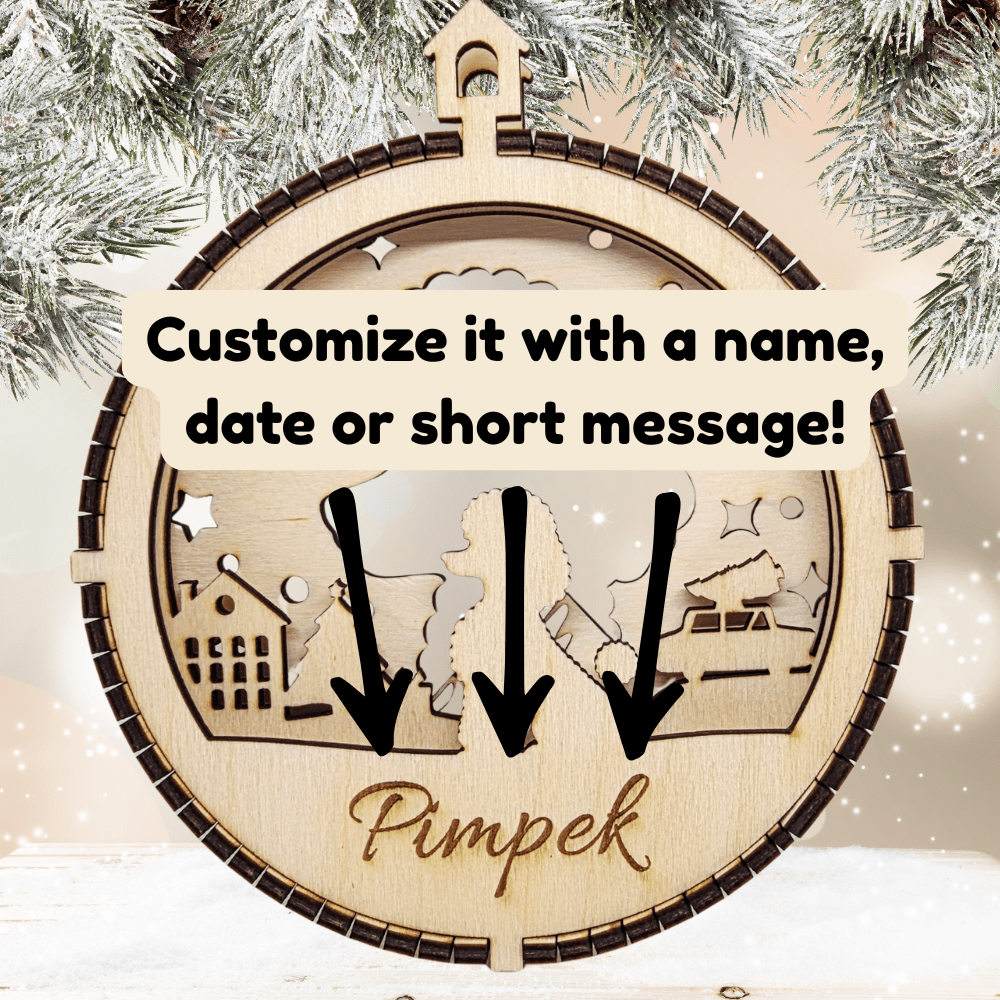 This ornament features a three-layer structure separated by a fine wooden band, creating an eye-catching illusion of depth and dimension — a true standout piece for your Christmas tree!