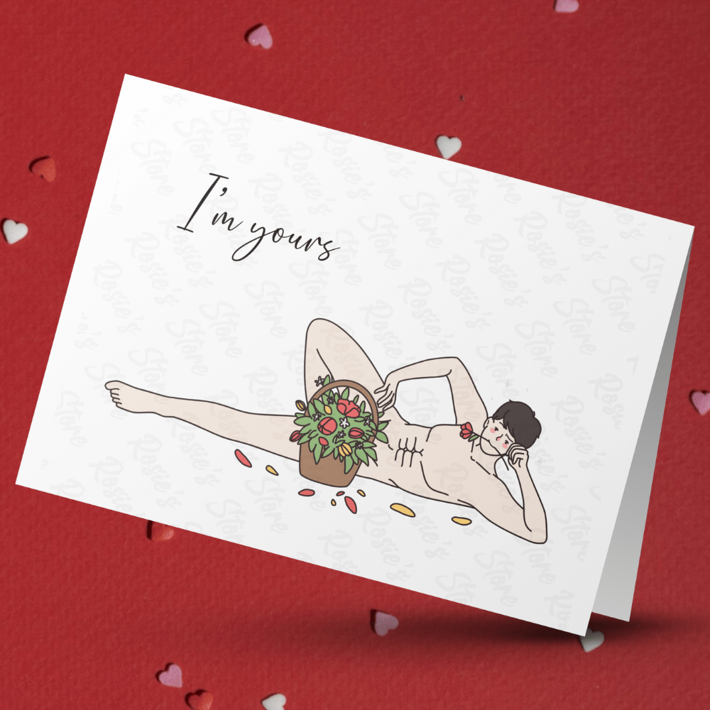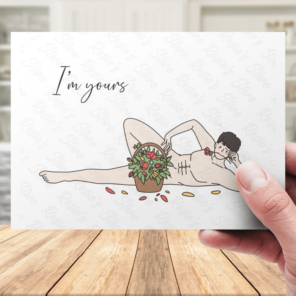 Introducing our playful and flirty greeting card: "I'm yours" featuring a cartoon drawing of a sexy naked man. This card comes in two options: Option 1 AS IS, and Option 2 can be customized with a short text of your choice. Measuring 4.25" x 5.5", this card is crafted from high-quality, ACID-FREE, thick, and durable paper - proudly MADE IN USA! A white envelope is included with each card for added convenience.