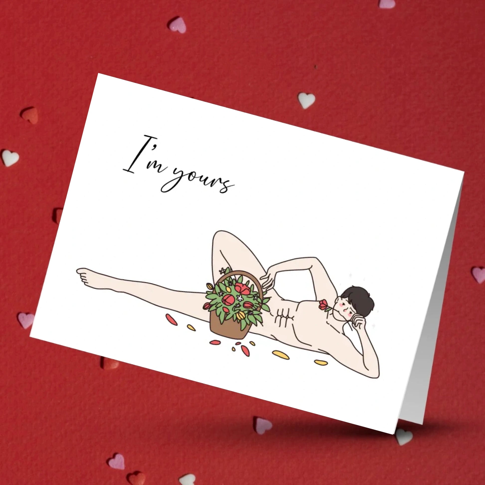 Add a playful and flirty touch to your special moments with this funny and cheeky romantic greeting card featuring a bold cartoon illustration and the simple message: