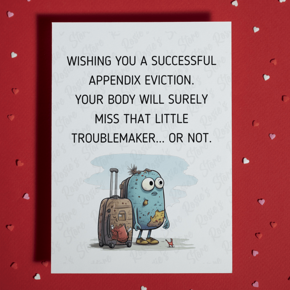 Made with premium materials and a dash of wit, our greeting card is a fantastic way to convey your support and humor during an appendix eviction. Order yours today and let the laughter begin!