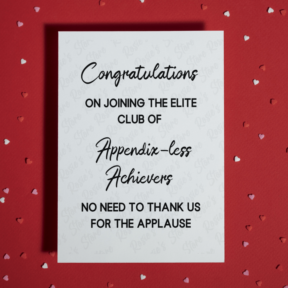 Introducing our witty and unique greeting card, designed especially for those who have joined the elite club of Appendix-less Achievers! Celebrate this remarkable milestone with our "Congratulations on joining the elite club of Appendix-less Achievers. No need to thank us for the applause" card, sure to bring a smile to your recipient's face.