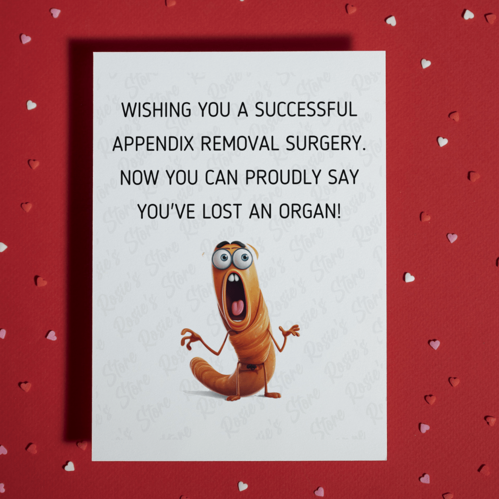 Introducing our hilarious and unconventional greeting card, perfect for celebrating a unique occasion - the retirement of your appendix! Our "Wishing you a successful appendix removal surgery. Now you can proudly say you've lost an organ!" card is designed to bring a smile to your recipient's face.