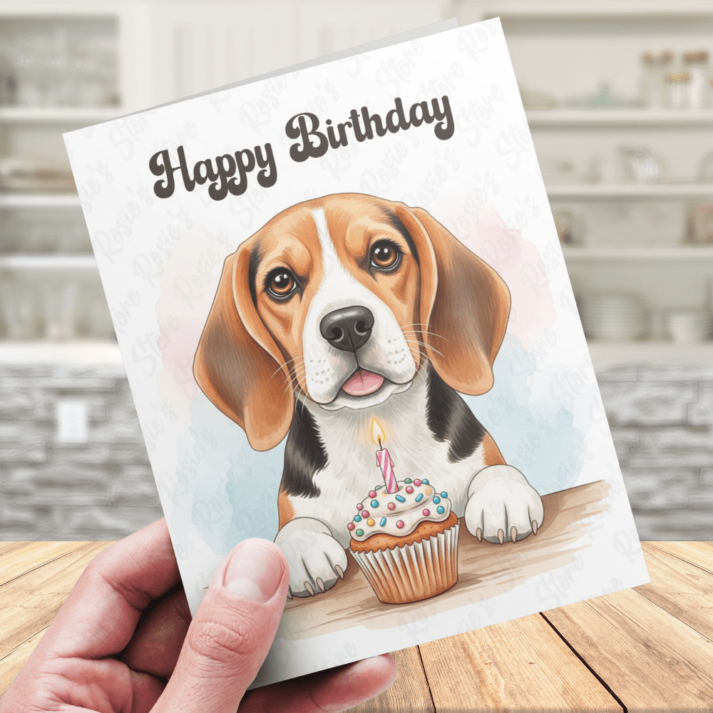 Send happy barks and birthday wishes with our charming "Happy Birthday" card, featuring an adorable watercolor illustration of a beagle dog eagerly eyeing a birthday cupcake! 🎂🐶 This delightful greeting card is purr-fect for any beagle dog pet lover, dog dad, or dog mom.