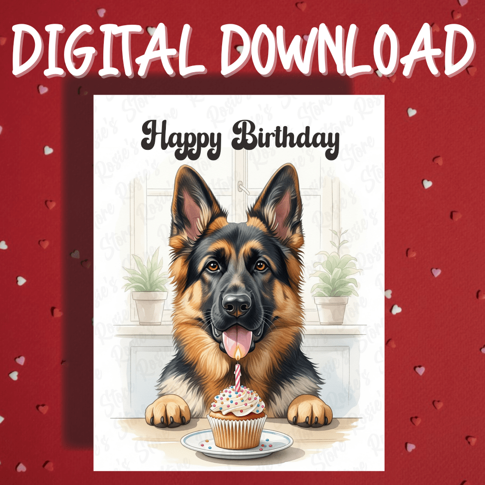 Celebrate a loyal friend with our "Happy Birthday" card, featuring a majestic watercolor illustration of a German Shepherd with a festive birthday cupcake! 🎂🐾 This unique illustrated card is the perfect way to honor any German Shepherd dog pet lover, dog dad, or dog mom.