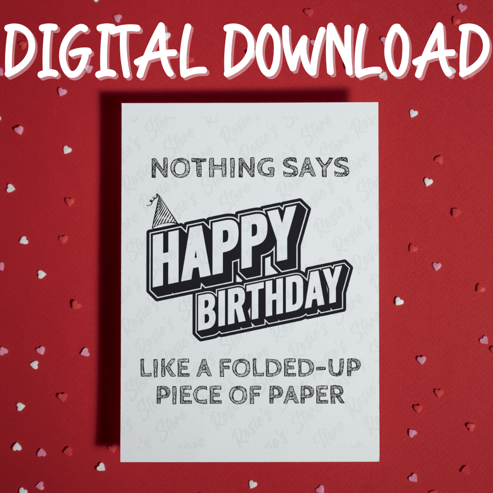 Presenting our digital download greeting card: "Nothing says Happy Birthday like a folded-up piece of paper." This hilarious and unique card is the perfect way to send your birthday wishes in style.