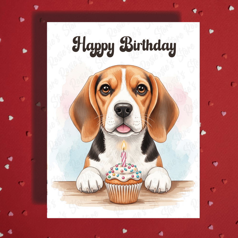 Send the perfect happy birthday wishes with this charming 4.25" x 5.5" greeting card featuring a delightful watercolor illustration of a Beagle, complete with a festive birthday cupcake! It's a unique and heartwarming design that's sure to bring a smile.