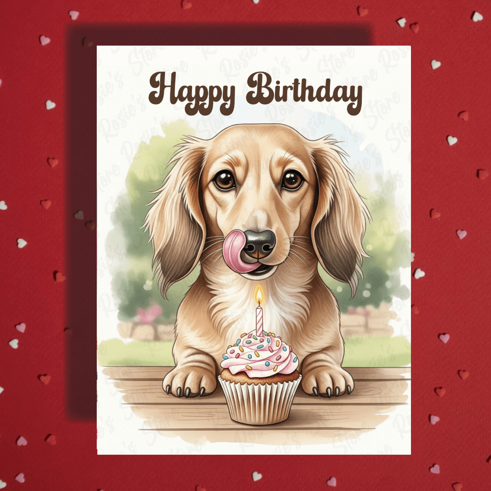 Send the perfect happy birthday wishes with this charming 4.25" x 5.5" greeting card featuring a delightful watercolor illustration of a Dachshund, complete with a festive birthday cupcake! It's a unique and heartwarming design that's sure to bring a smile.