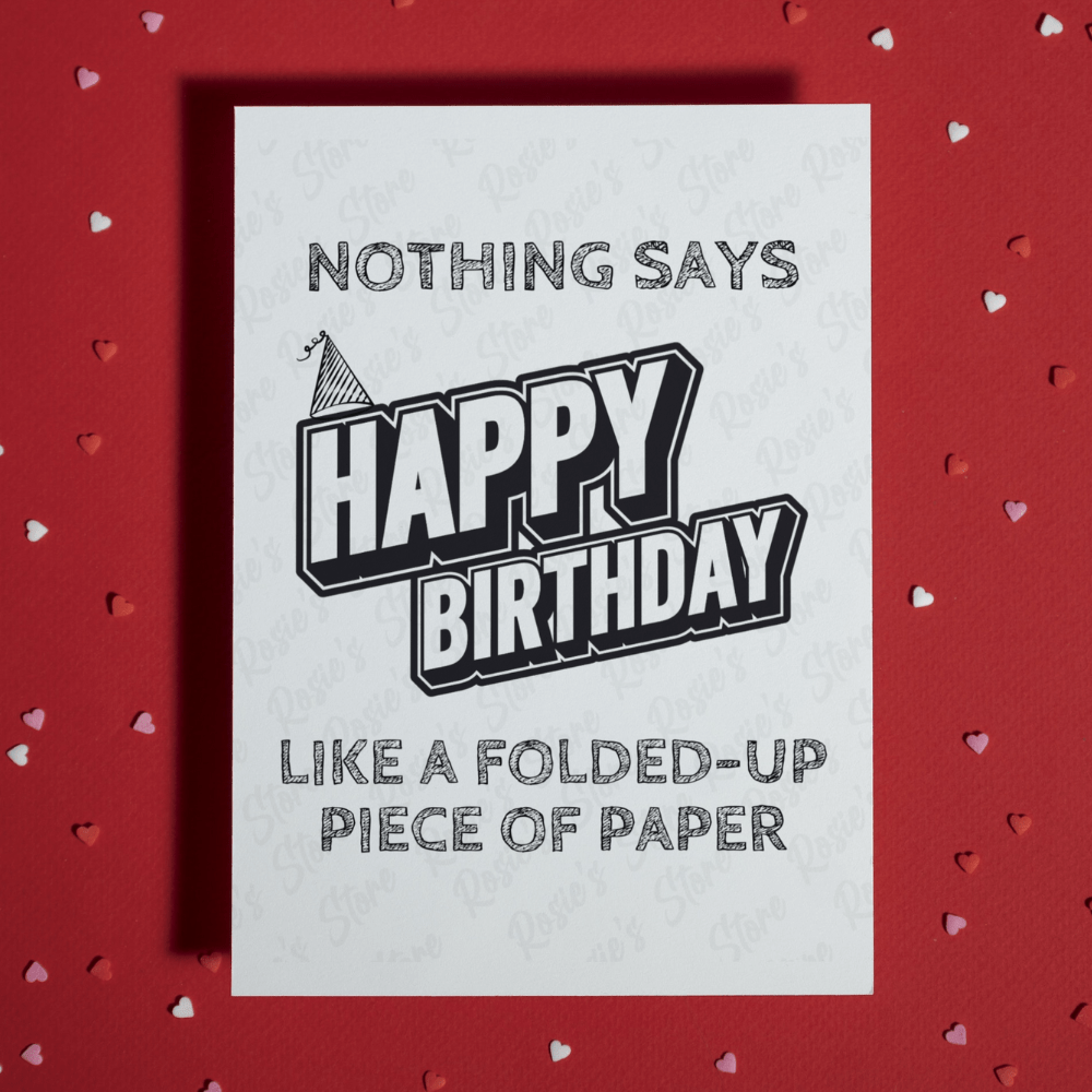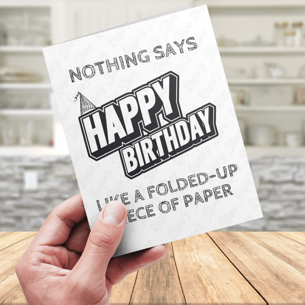 So, don't settle for the ordinary when you can give the gift of laughter! Purchase our "Nothing says Happy Birthday like a folded-up piece of paper" greeting card today and make someone's birthday truly memorable. Let the celebration begin!