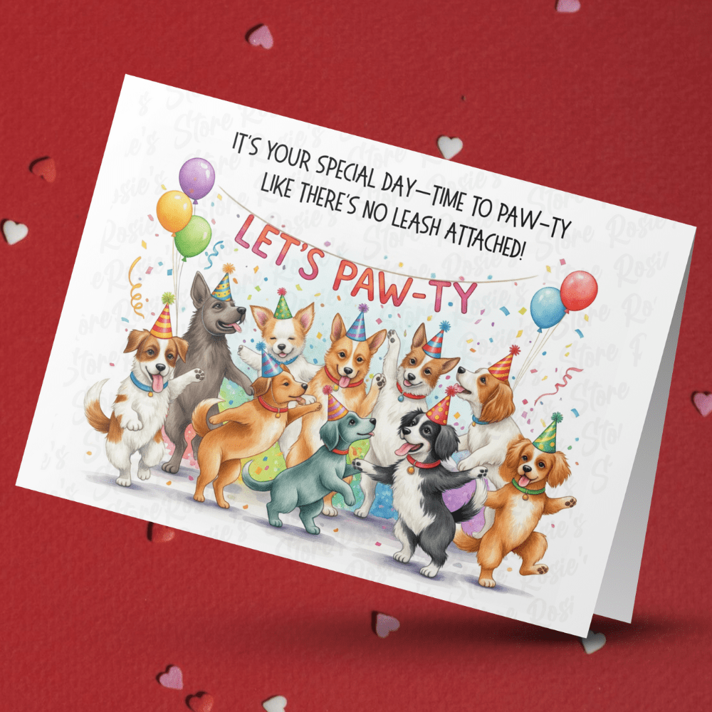 The front of this unique greeting card features a vibrant watercolor illustration of a group of happy dogs wearing their birthday hats and ready to paw-ty! It's a truly funny dogs card and a charming addition to our illustrated cards collection. 🐾🎂🎉