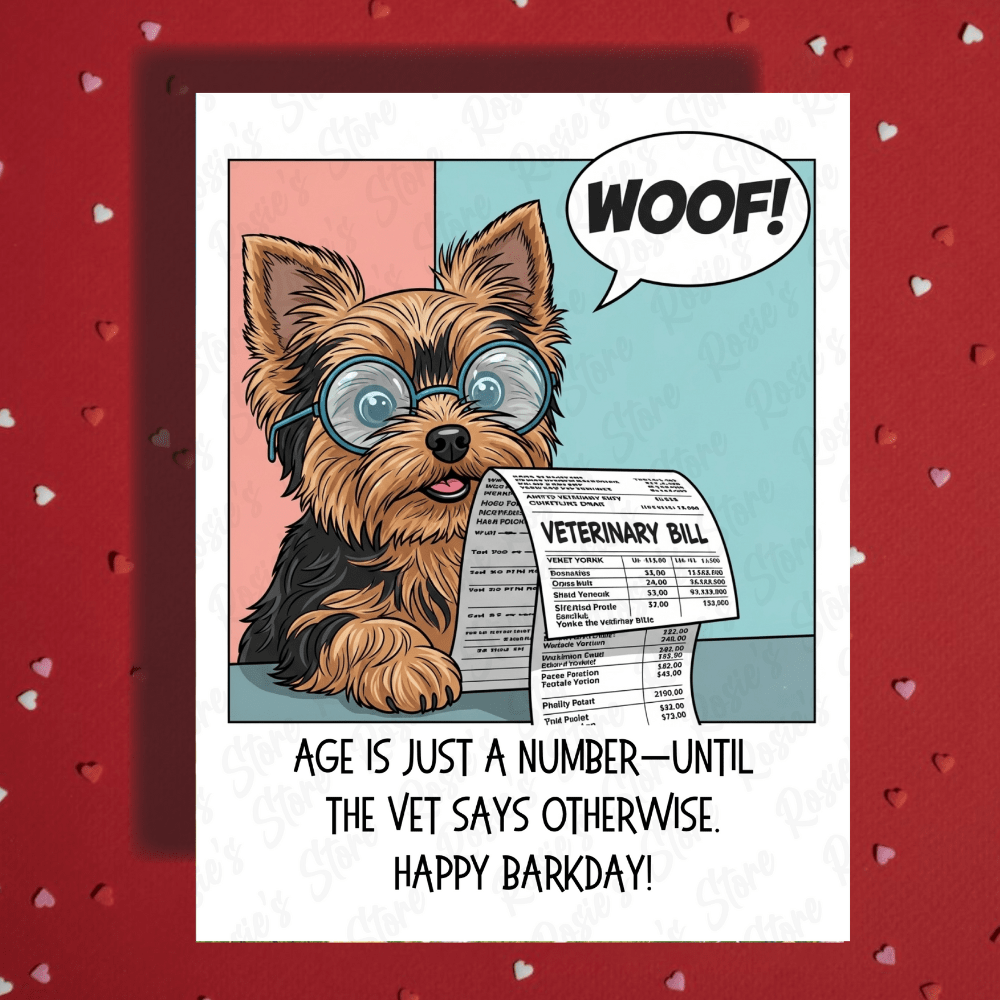 The front of this unique greeting card features a charming watercolor illustration of a Yorkie wearing reading glasses, looking comically dismayed at a veterinary bill. A speech bubble above its head reads "Woof!" adding to the comic-strip style humor. This funny yorkie card is a must-have yorkie card for anyone who loves their furry friends! 🐶👓💸