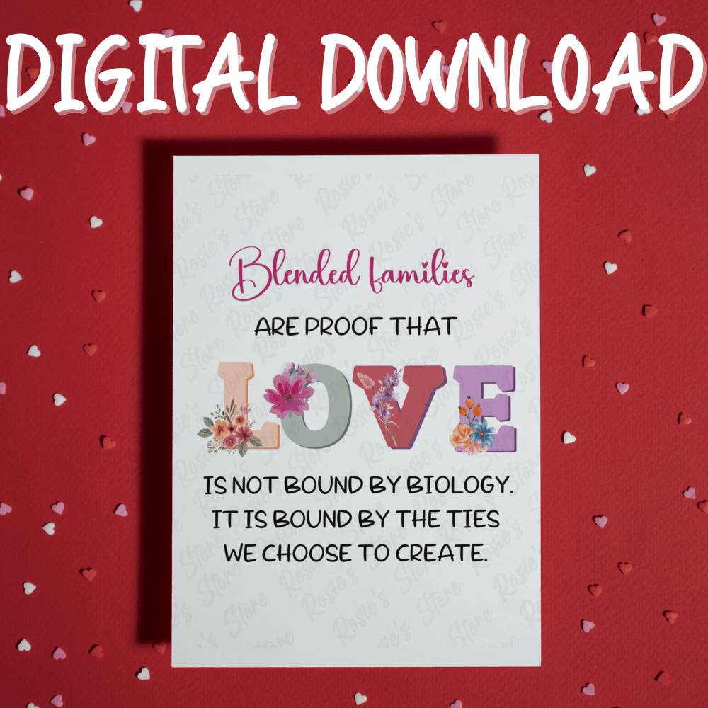 Celebrate the power of love and the beauty of blended families with our heartfelt digital download greeting card. Our "Blended families are proof that love is not bound by biology. It is bound by the ties we choose to create" card beautifully captures the essence of love, connection, and the unique bonds that are formed through choice and devotion.