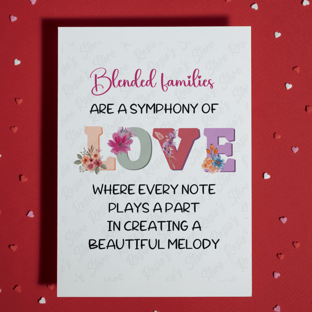 Celebrate the harmonious beauty of blended families with our heartfelt greeting card. Our "Blended families are a symphony of love where every note plays a part in creating a beautiful melody" card captures the essence of love, unity, and the unique dynamics that come together to create something truly extraordinary.