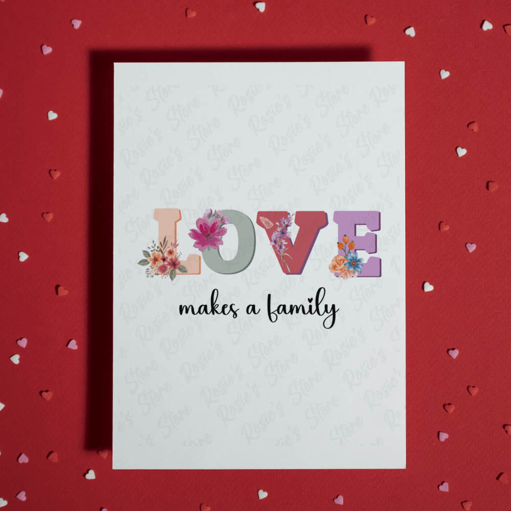 Crafted with care, this high-quality card features a timeless design that showcases the heartfelt message, "Love Makes a Family." Its simple yet profound words beautifully capture the essence of what truly matters—the love and connection shared among loved ones.