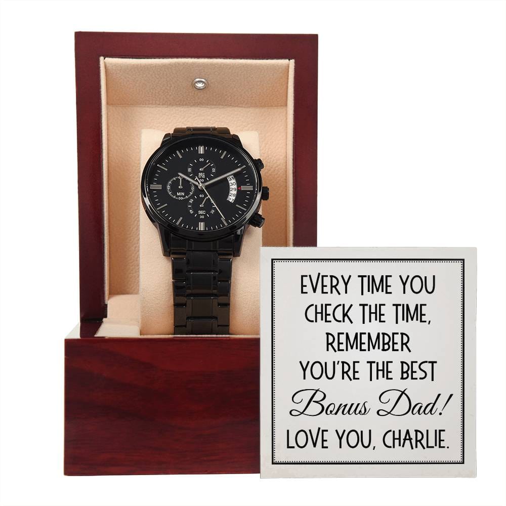 Celebrate your bonus dad with a gift that blends style and sentimentality! This Black Chronograph Watch is a striking accessory designed to withstand constant use, making it an ideal present for any occasion. Whether it's a thoughtful birthday gift, a cherished anniversary memento, or a long-lasting keepsake for Father’s Day, this watch is sure to warm hearts and create smiles.