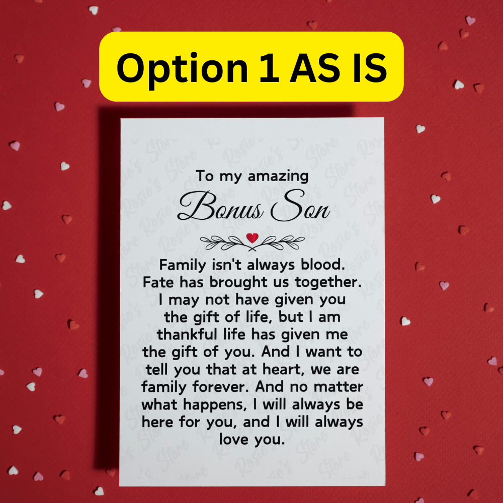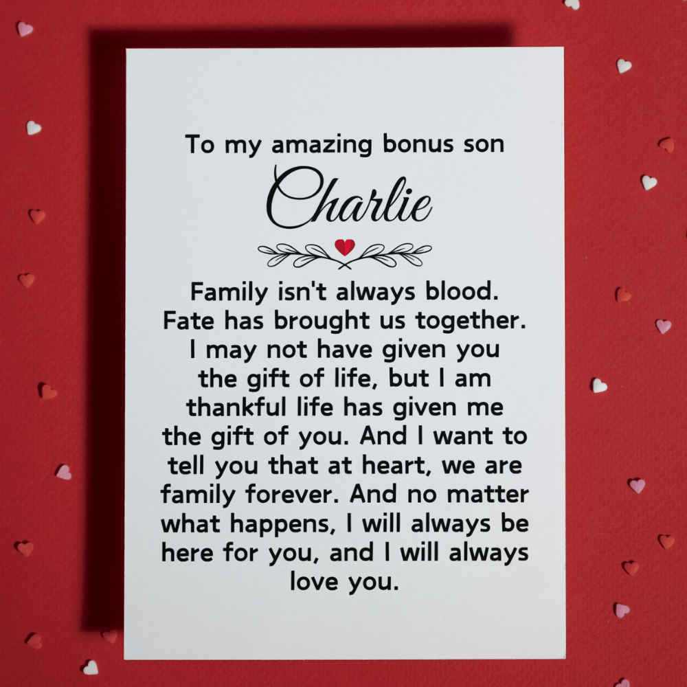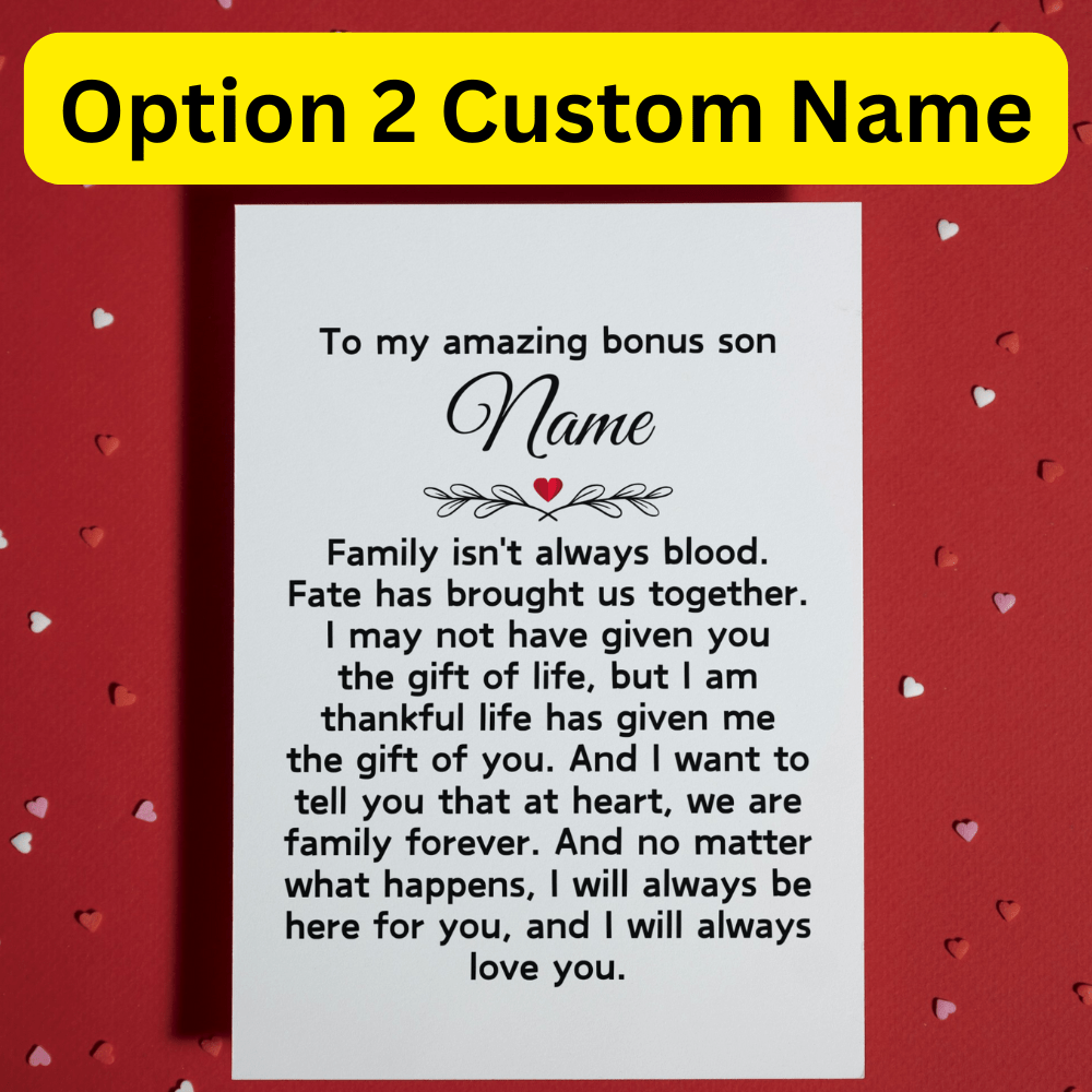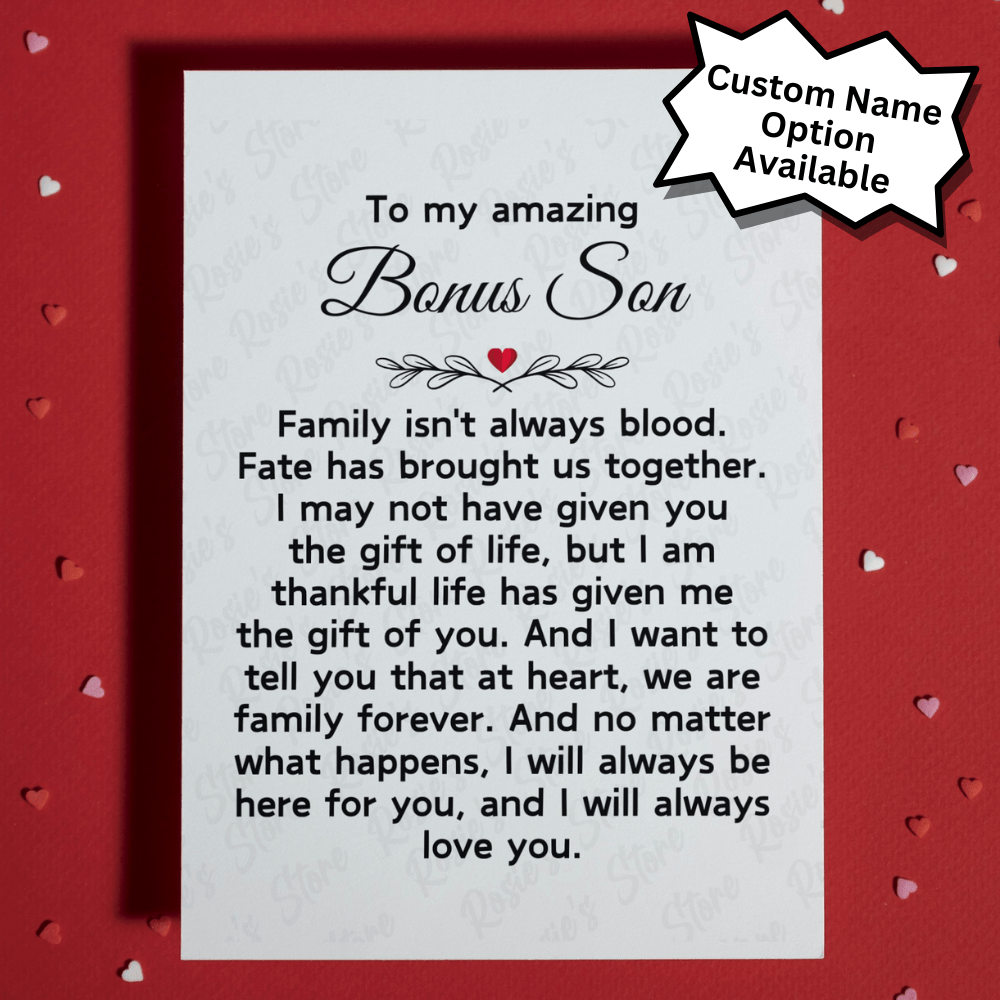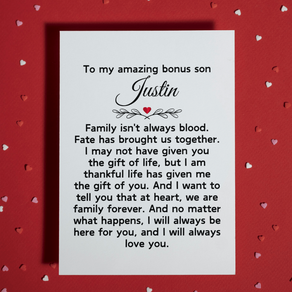 Introducing our heartfelt greeting card for a bonus son: "To my amazing Bonus Son. Family isn't always blood. Fate has brought us together. I may not have given you the gift of life, but I am thankful life has given me the gift of you. And I want to tell you that at heart, we are family forever. And no matter what happens, I will always be here for you, and I will always love you."