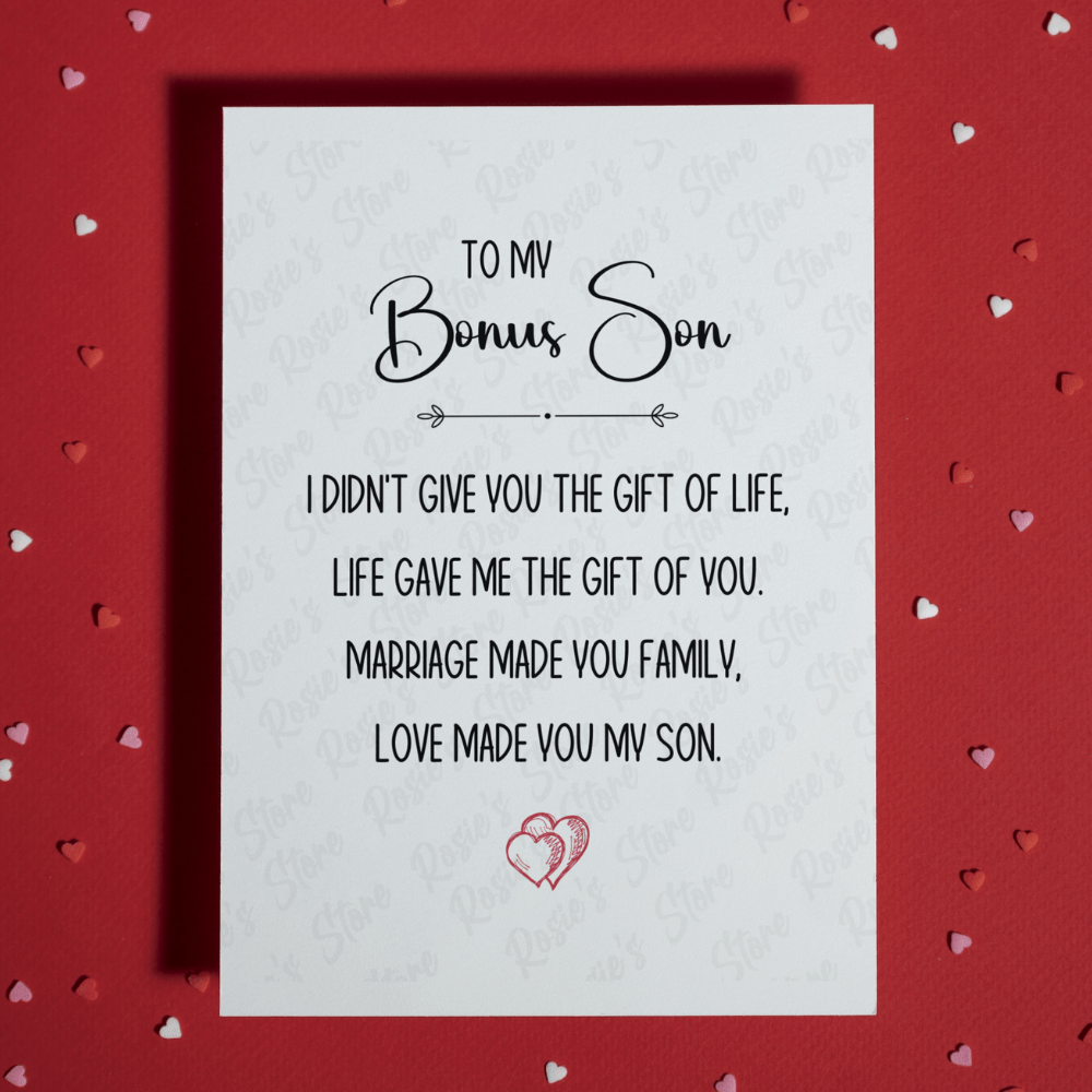 Perfect for birthdays, Christmas, or any occasion, this card is a thoughtful way to celebrate your bonus son and let him know that he holds a special place in your heart.