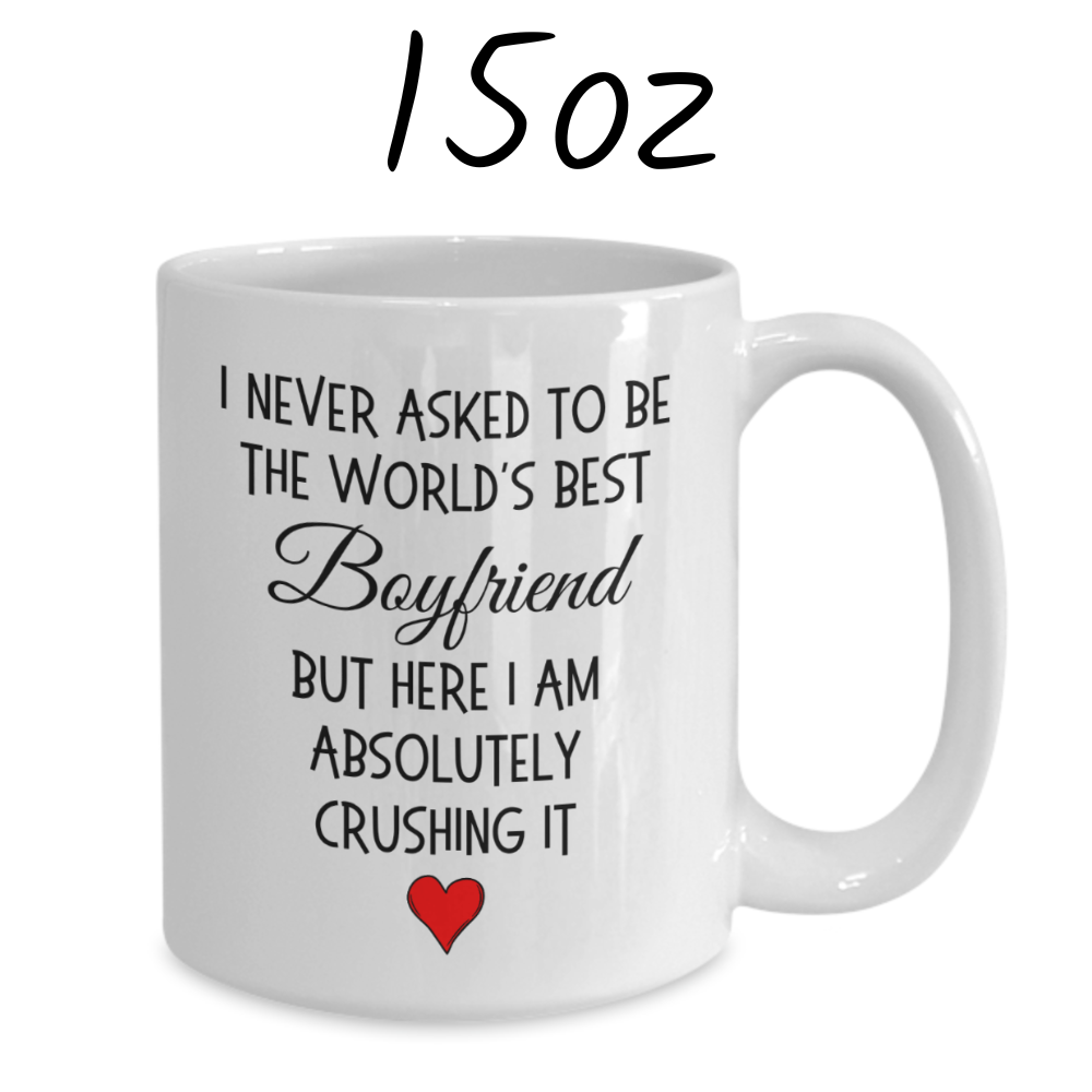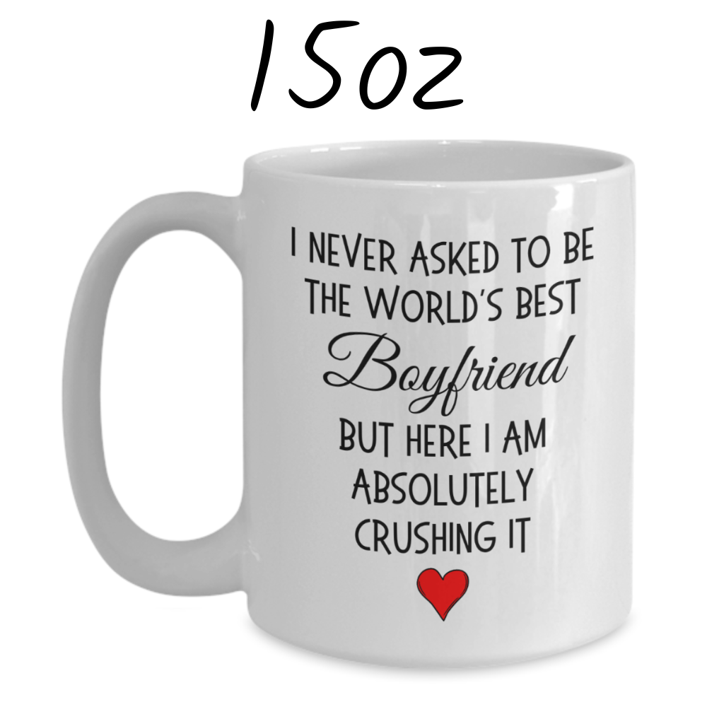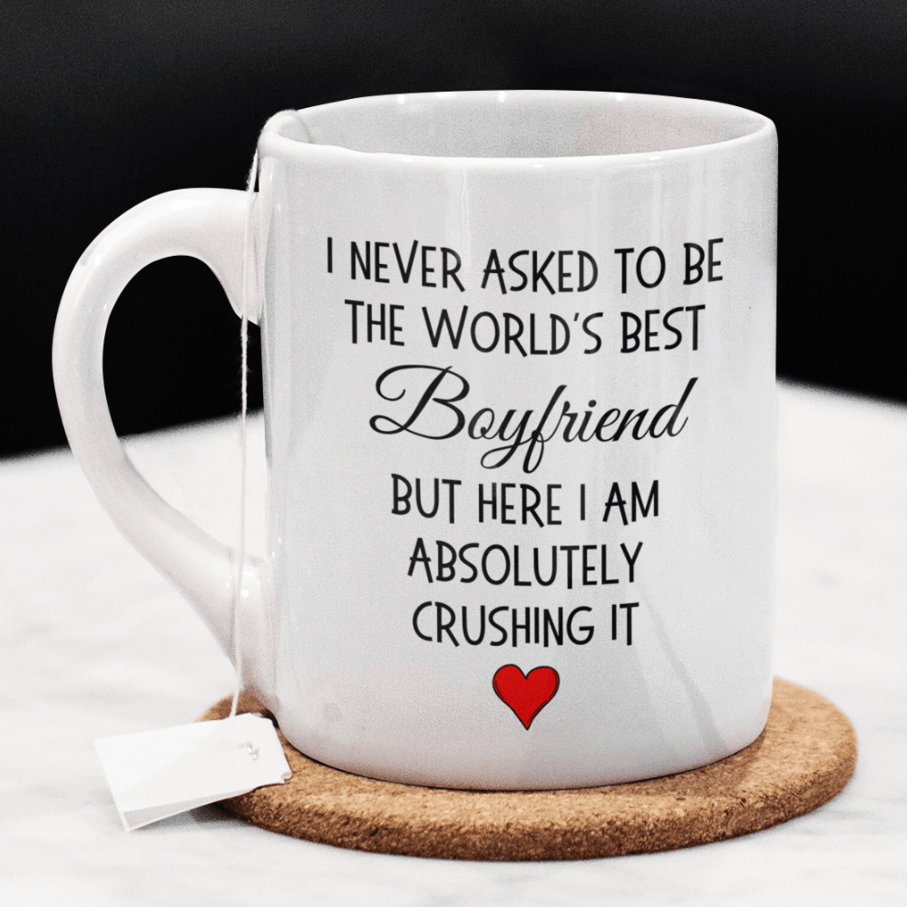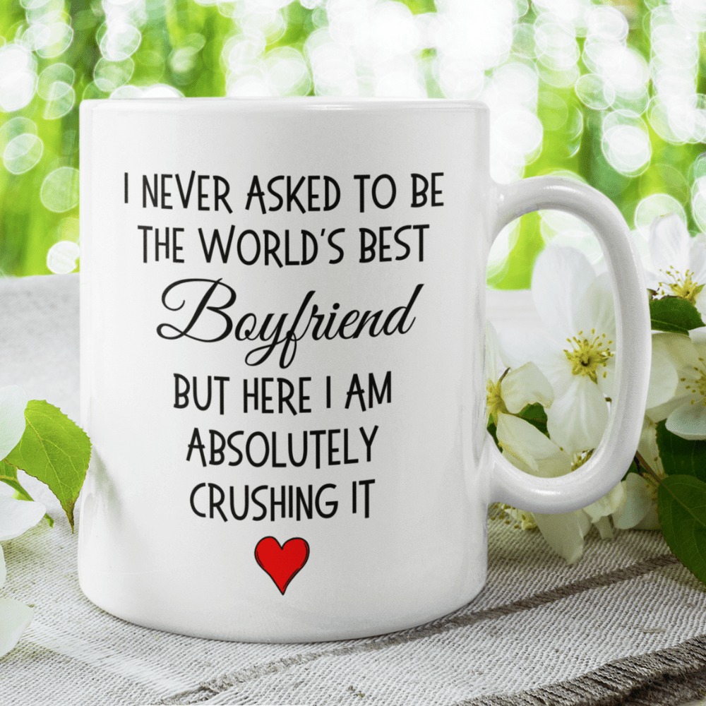 Boost your boyfriend's day with a dose of confidence and humor with our white ceramic coffee mug that proudly boasts, "I NEVER ASKED TO BE THE WORLD'S BEST BOYFRIEND BUT HERE I AM ABSOLUTELY CRUSHING IT." Adorned with a playful cartoon heart beneath the text, this mug is perfect for giving a smile along with his favorite brew.