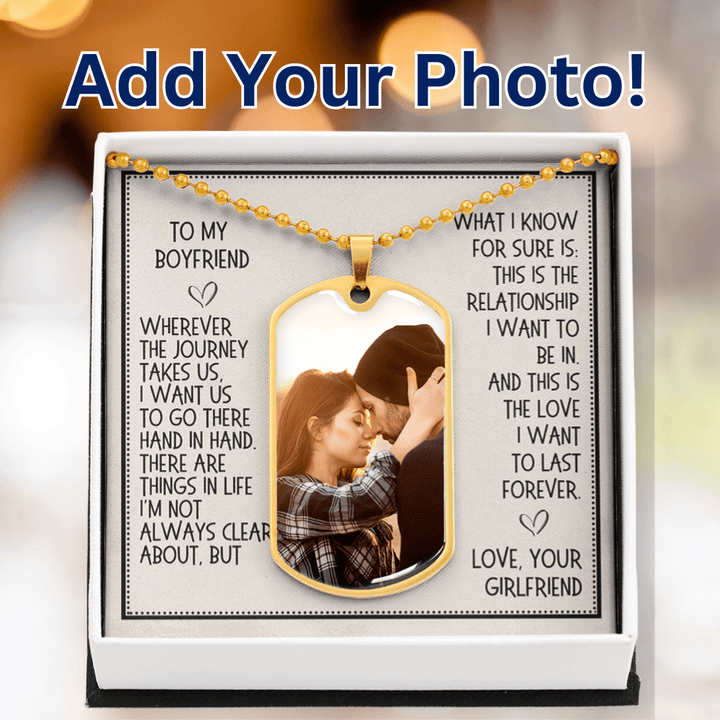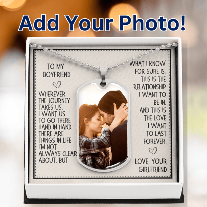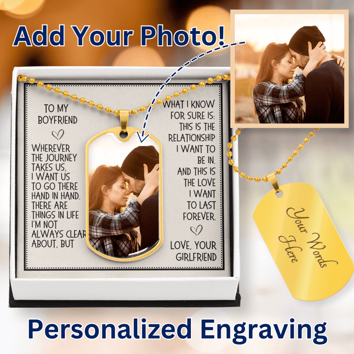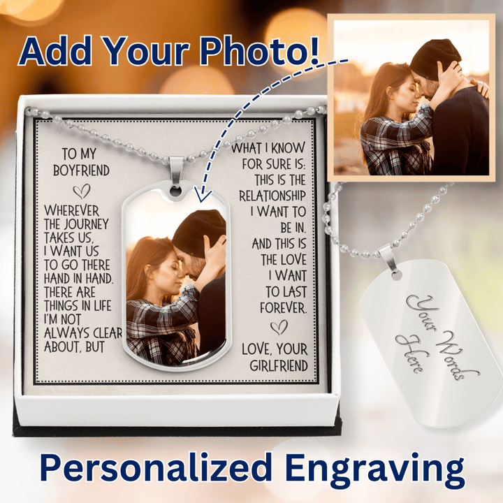 Make your special someone feel truly loved with this exquisite dog tag necklace, complete with a heartfelt message card and a gift box. This necklace is the perfect keepsake for your boyfriend, ideal for any occasion.