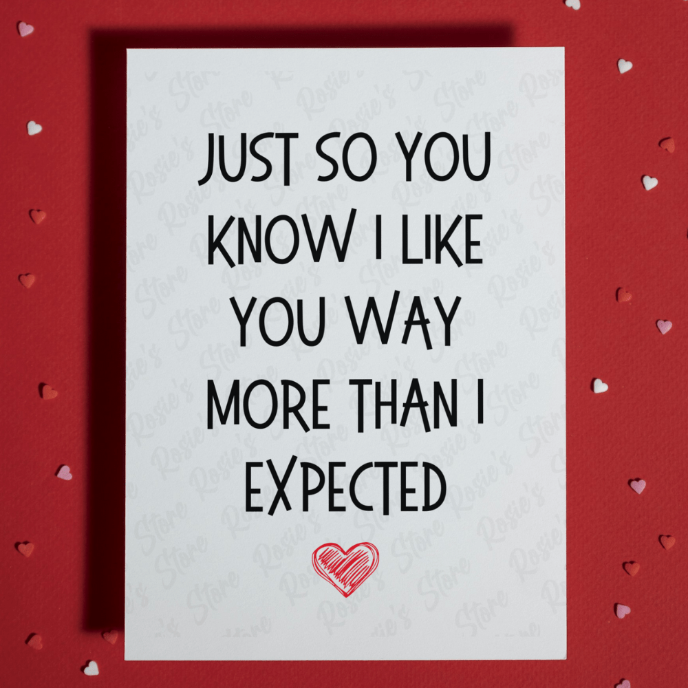 - Front Cover: Features the lighthearted and sweet message, "Just so you know I like you way more than I expected." This charming statement is perfect for expressing your growing affection in a fun and memorable way.