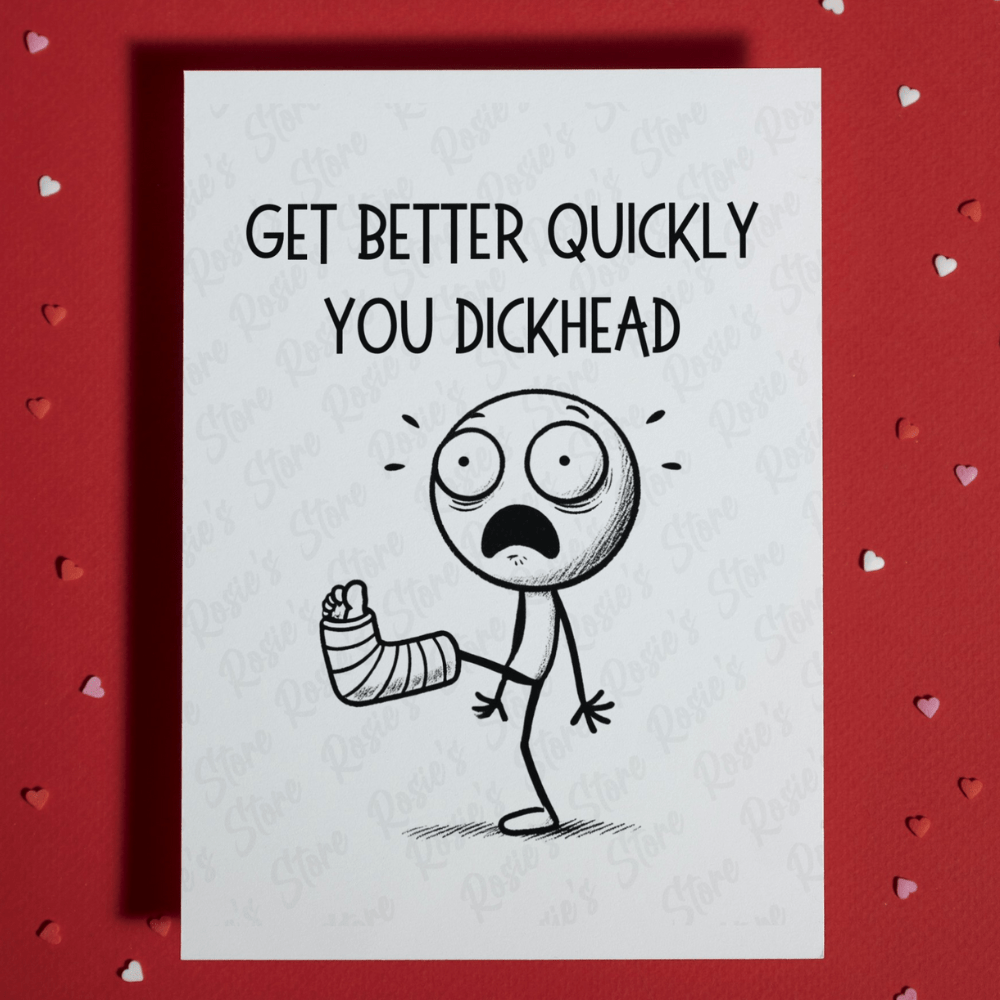 - Front Cover: Features the funny and direct message, "Get better quickly you dickhead," accompanied by a cartoon drawing of a stick man with a broken leg. This humorous statement and playful illustration are perfect for lightening the mood and showing your unique sense of humor.