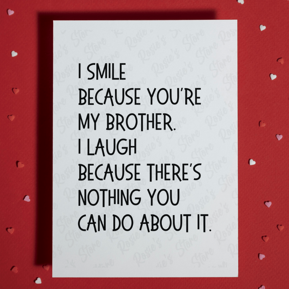 • Front Cover: Features the witty and playful message, "I smile because you're my brother. I laugh because there's nothing you can do about it." This sarcastic and humorous statement is sure to resonate with your brother and highlight the fun and teasing dynamics of your bond.